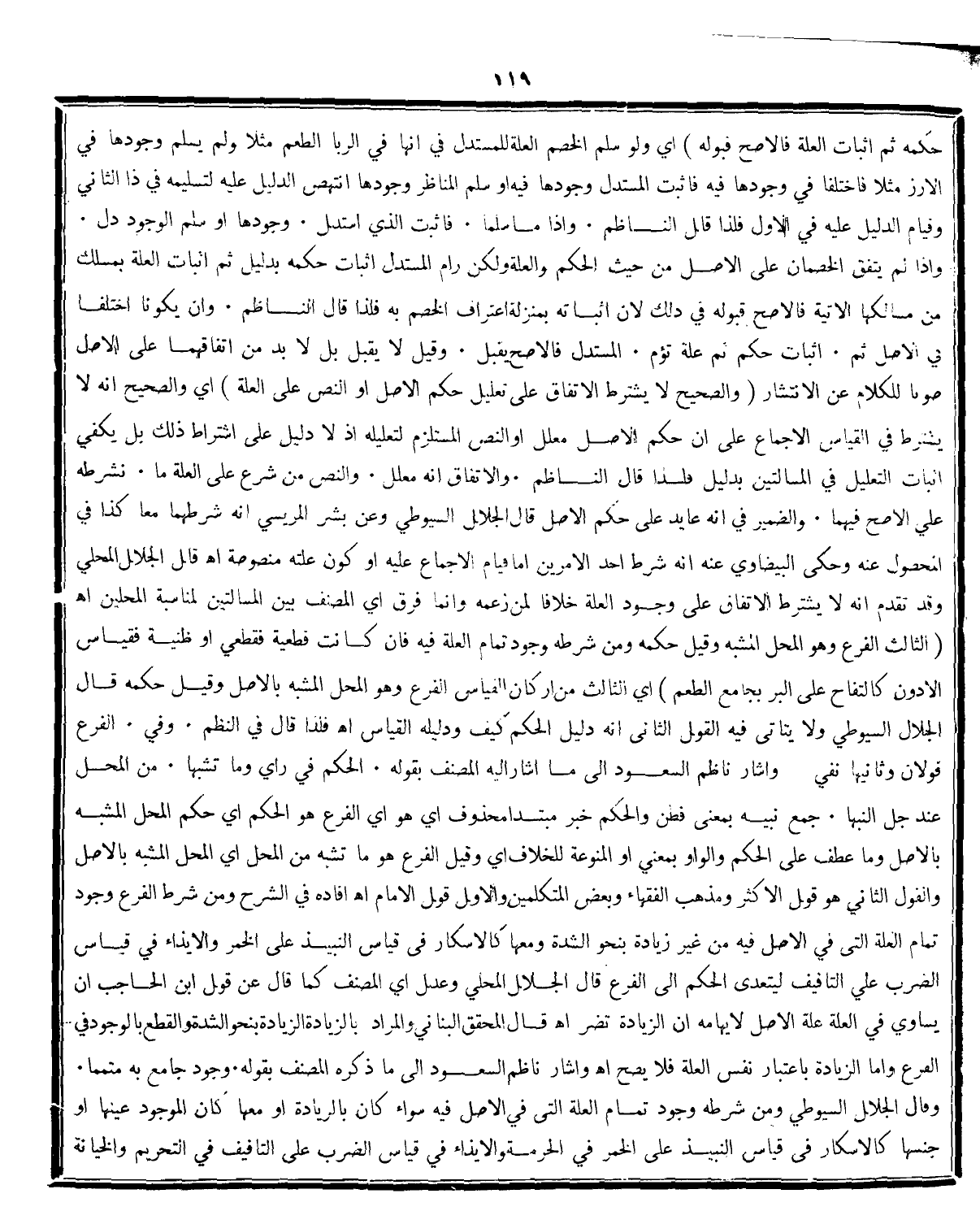 فالاصح قبوله في ذلك لان اثباته بمنزلة اعتراف الخصم به فلذا قال الناظم وان يكونا اختلفا في الاصل ثم اثبات حكم ثم علة تؤم المستدل فالاصح يقبل وقيل لا يقبل بل لا بد من اتفاقهما على الاصل صوبا للكلام عن الانتشار والصحيح لا يشترط الاتفاق على تعليل حكم الاصل او النص على العلة اي والصحيح انه لا يشترط في القياس الاجماع على ان حكم الاصل معلل او النص المستلزم لتعليله اذ لا دليل على اشتراط ذلك بل يكفي اثبات التعليل في المسالتين بدليل فلذا قال الناظم والاتفاق انه معلل والنص من شرع على العلة ما نشرطه على الاصح فيهما والضمير في انه عايد على حكم الاصل قال الجلال السيوطي وعن بشر المريسي انه شرطهما معا كذا في المحصول عنه وحكى البيضاوي عنه انه شرط احد الامرين اما قيام الاجماع عليه او كون علته منصوصة اهـ قال الجلال المحلي وقد تقدم انه لا يشترط الاتفاق على وجود العلة خلافا لمن زعمه وانما فرق أي المصنف بين المسالتين لمناسبة المحلين اهـ الثالث الفرع وهو المحل المشبه وقيل حكمه ومن شرطه وجود تمام العلة فيه فان كانت قطعية فقطعي او ظنية فقياس الا دون كالتفاح على البر بجامع الطعم أي الثالث من اركان القياس الفرع وهو المحل المشبه بالاصل وقيل حكمه قال الجلال السيوطي ولا يتاتى فيه القول الثانى انه دليل الحكم كيف ودليله القياس اهـ فلذا قال في النظم وفي الفرع قولان وثانيها نفي واشار ناظم السعود الى ما اشار اليه المصنف بقوله الحكم في راي وما تشبها من المحل عند جل النبها جمع نبيه بمعنى فطن والحكم خبر مبتدا محذوف أي هو أي الفرع هو الحكم أي حكم المحل المشبه بالاصل وما عطف على الحكم والواو بمعني او المنوعة للخلاف أي وقيل الفرع هو ما تشبه من المحل أي المحل الامشبه بالاصل والقول الثاني هو قول الاكثر ومذهب الفقهاء وبعض المتكلمين والاول قول الامام اهـ افاده في الشرح ومن شرط الفرع وجود تمام العلة التى في الاصل فيه