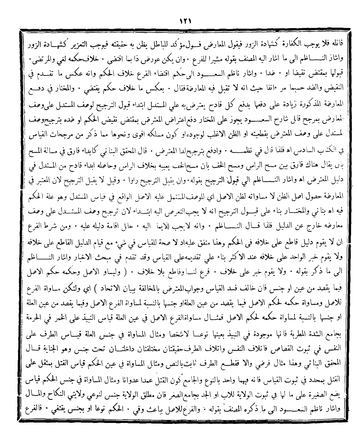 قائله فلا يوجب الكفارة كشهادة الزور فيقول المعارض قول مؤكد للباطل يظن به حقيقته فيوجب التعزير كشهادة الزور واشار الناظم الى ما اشار اليه المصنف بقوله مشيرا للفرع وان يكن عورض ذا بما اقتضى خلاف حكمه لغي والمرتضى قبولها بمقتض نقيضا او ضدا واشار ناظم السعود الى حكم اقتضاء الفرع خلاف الحكم وانه عكس ما تقدم في النقيض والضد حسبما مر ءانفا حيث انه لا تقبل فيه المعارضة فقال بعكس ما خلاف حكم يقتضى والمختار في دفع المعارضة المذكورة زيادة على دفعها بدفع كل قادح يعترض به علي المستدل ابتداء قبول الترجيح لوصف المستدل على وصف المعارض بمرجح قال شارح السعود يجوز على المختار دفع اعتراض المعترض بمقتض نقيض الحكم اوضده بترجيح وصف لمستدل على وصف المعترض بقطعيته او الظن الاغلب لوجوده او كون مسلكه اقوى ونحوها مما ذكر من مرجحات القياس في الكتاب السادس اهـ فلذا في نظمه وادفع بترجيح لدا المعترض قال المحقق البناني كابداء فارق في مسالة المسح بان يقال هناك فارق بين مسح الراس ومسح الخف بان مسح الخف يعيبه بخلاف الراس وحاصله ابداء قادح من المستدل في دليل المعترض اهـ واشار الناظم الي قبول الترجيح بقوله وان يقبل الترجيح راوا وقيل لا يقبل الترجيح لان المعتبر في المعارضة حصول اصل الظن لا مساواته لظن الاصل أي للوصف المشتمل عليه الاصل الواقع في قياس المستدل وهو علة الحكم فيه اهـ بناني والمختار بناء على قبول الترجيح انه لا يجب التعرض اليه ابتداء لان ترجيح وصف المستدل على وصف معارضة خارج عن الدليل فلذا قال الناظم وانه لايجب الايما اليه حال اقامة دليله عليه ومن شرط الفرع ان لا يقوم دليل قاطع على خلافه فى الحكم وهذا متفق عليه اذ لا صحة للقياس في شيء مع قيام الدليل القاطع على خلافه ولا يقوم خبر الواحد على خلافه