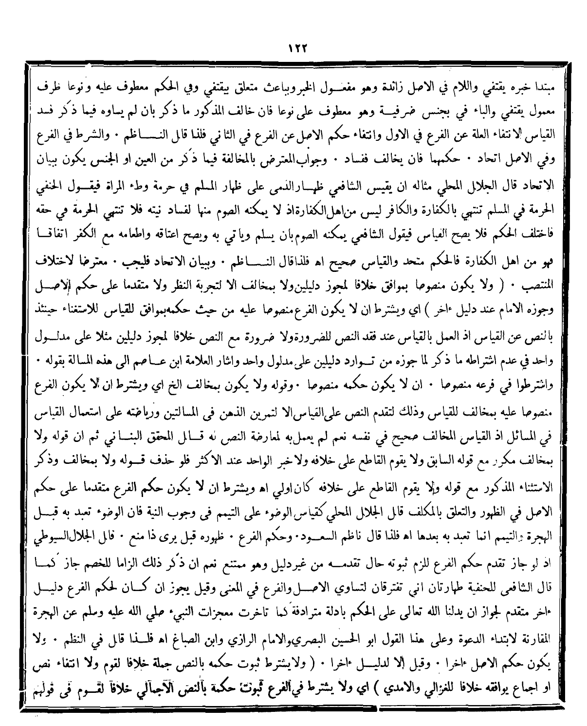 ثبوته حال تقدمه من غير دليل وهو ممتنع نعم ان ذكر ذلك الزاما للخصم جاز كما قال الشافعي للحنفية طهارتان انى تفترقان لتساوي الاصل والفرع في المعنى وقيل يجوز ان كان لحكم الفرع دليل ءاخر متقدم لجواز ان يدلنا الله تعالى على الحكم بادلة مترادفة كما تاخرت معجزات النبيء صلي الله عليه وسلم عن الهجرة المقارنة لابتداء الدعوة وعى هذا القول ابو الحسن البصري والامام الرازي وابن الصباغ اهـ فلذا قال في النظم ولا يكون حكم الاصل ءاخرا وقيل الا لدليل ءاخرا ولا يشترط ثبوت حكمه بالنص جملة خلافا لقوم ولا انتفاء نص او اجماع يوافقه خلافا للغزالي والامدي أي ولا يشترط في الفرع ثبوت حكمه بالنص الاجمالي خلافا لقوم فى قولهم