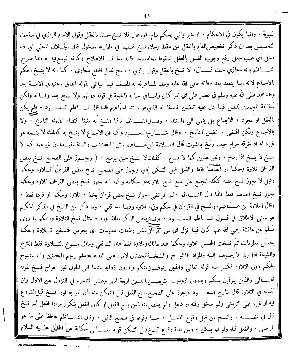 وانما يكون فى الاحكام ... او خبر ياتى بحكم سام. أي عال فلا نسخ حينئذ بالعقل وقول الامام الرازي فى مباحث التخصيص بعد ان ذكر تخصيص العام بالعقل من سقط رجلاه نسخ غسلهما فى طهارته مدخول قال الجلال المحلى: أَيْ فِيهِ دَخْلٌ أَيْ عَيْبٌ حَيْثُ جَعَلَ رَفْعَ وُجُوبِ الْغُسْلِ بِالْعَقْلِ لِسُقُوطِ مَحَلِّهِ نَسْخًا فَإِنَّهُ مُخَالِفٌ لِلِاصْطِلَاحِ وَكَوْنُهُ تَوَسَّعَ فِيهِ اه.