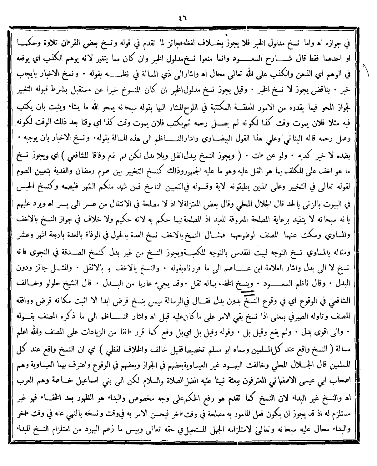 وقوله وقيل بل أي بل وقع كما قرر آنفا من الزيادات على المصنف والله اعلم (مَسْأَلَةٌ النَّسْخُ وَاقِعٌ عِنْدَ كُلِّ الْمُسْلِمِين وَسَمَّاهُ أَبُو مُسْلِم تَخْصِيصًا فَقِيلَ: خَالَفَ فَالْخُلْف لفظى) أي ان النَّسْخُ وَاقِعٌ عِنْدَ كُلِّ الْمُسْلِمِين قال الجلال المحلى: وَخَالَفَتْ الْيَهُودُ غَيْرَ الْعِيسَوِيَّةِ بَعْضَهُمْ فِي الْجَوَازِ، وَبَعْضَهُمْ فِي الْوُقُوعِ وَاعْتَرَفَ بِهِمَا الْعِيسَوِيَّةُ وَهُمْ أَصْحَابُ أَبِي عِيسَى الْأَصْفَهَانِيِّ الْمُعْتَرِفُونَ بِبَعْثَةِ نَبِيِّنَا عَلَيْهِ أَفْضَلُ الصَّلَاةِ وَالسَّلَامِ لَكِنْ إلَى بَنِي إسْمَاعِيلَ خَاصَّةً، وَهُمْ الْعَرَب اه. والنسخ غير البداء لان السنخ كما تقدم هو رفع الحكم على وجه مخصوص والبداء هو الظهور بعد الخفاء فهو غير مستلزم له اذ قد يجوز ان يكون فعل المامور به مصلحة فى وقت آخر فيحسن الامر به فى وقت ونسخه بالنهى عنه فى وقت آخر والبدء محال عليه سبحانه وتعالى لاستلزامه الجهل المستحيل فى حقه تعالى وبئس ما زعم اليهود من استلزام النسخ للبداء