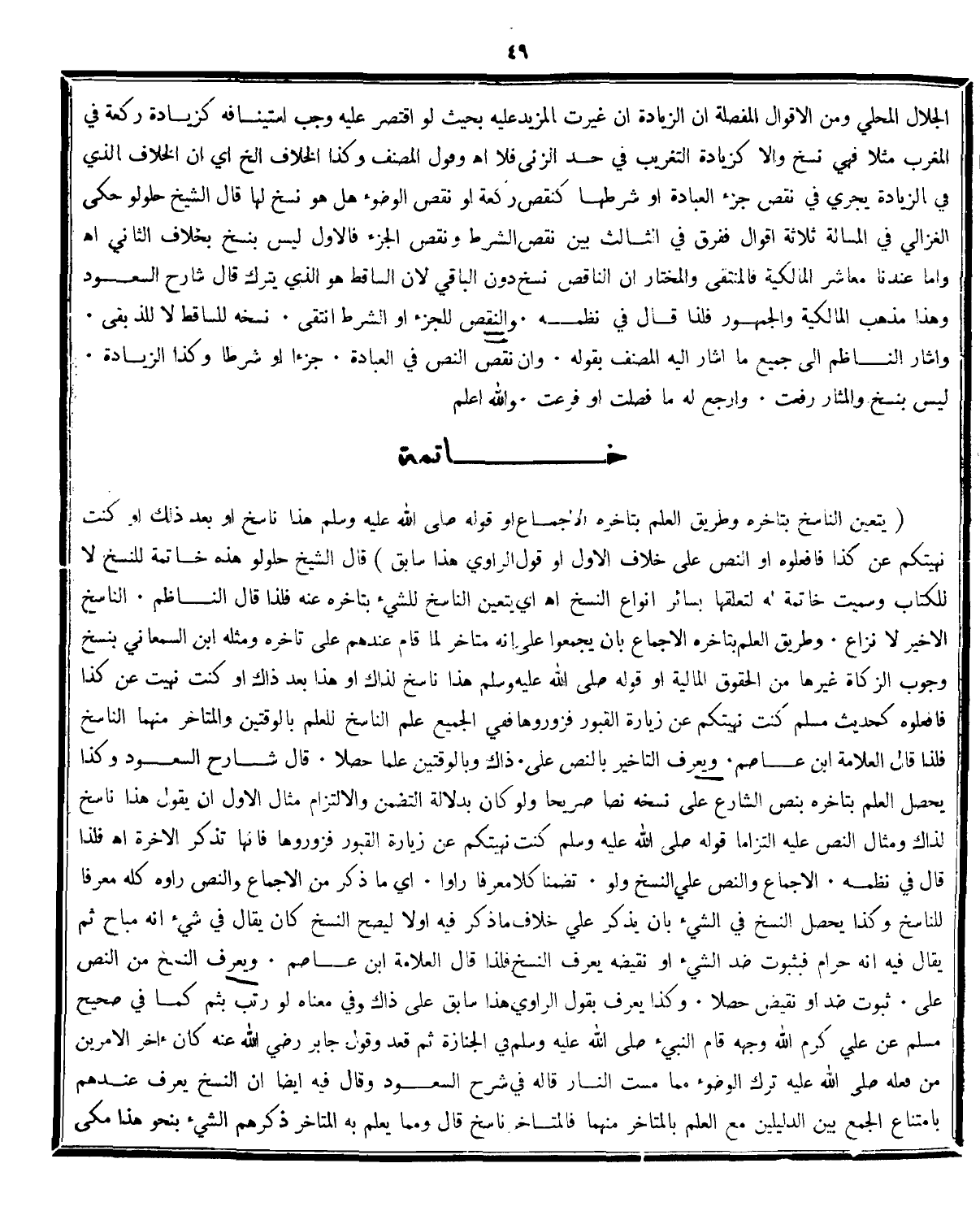 الجلال المحلى: ومِنْ الْأَقْوَالِ الْمُفَصَّلَةِ أَنَّ الزِّيَادَةَ إنْ غَيَّرَتْ الْمَزِيدَ عَلَيْهِ بِحَيْثُ لَوْ اقْتَصَرَ عَلَيْهِ وَجَبَ اسْتِئْنَافُهُ كَزِيَادَةِ رَكْعَةٍ فِي الْمَغْرِبِ فَهِيَ نَسْخٌ، وَإِلَّا كَزِيَادَةِ التَّغْرِيبِ فِي حَدِّ الزِّنَا فلا اه. وقول المصنف وكذا الخلاف الخ أي ان الخلاف الذي فى الزيادة يجري فى نقص جزء العبادة او شرطها كنقص ركعة او نقص الوضوء هل هو نسخ لها قال الشيخ حلولو حكى الغزالى فى المسالة ثلاثة اقوال ففرق فى الثالث بين نقص الشرط وبين نقص الجزء فالاول ليس بنسخ بخلاف الثانى اه. واما عندنا معاشر المالكية فالمنتقى والمختار ان الناقص نسخ دون الباقى لان الساقط هو الذي قال شارح وهذا مذهب المالكية والجمهور فلذا قال فى نظمه: