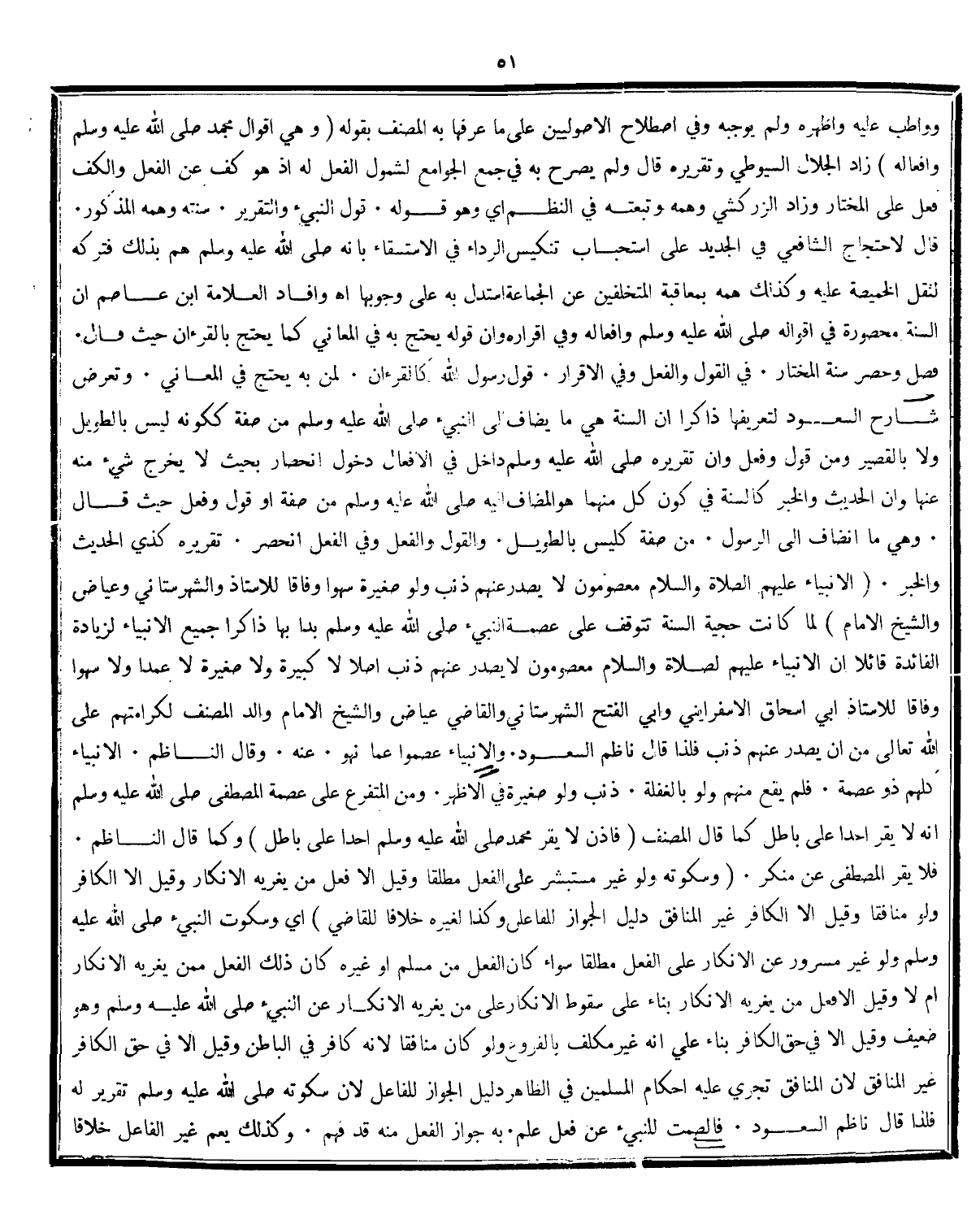وتعرض شارح السعود لتعريفها ذاكرا ان السنة هى ما يضاف الى النبىء صلى الله عليه وسلم من صفة ككونه ليس بالطويل ولا بالقصير ومن قول وفعل وان تقريره صلى الله عليه وسلم داخل فى الافعال دخول انحصار بحيث لا يخرج شيء منه عنها وان الحديث والخبر كالسنة فى كون كل منهما هو المضاف اليه صلى الله عليه وسلم من صفة او قول وفعل حيث قال: وهي ما انضاف إلى الرسول.....من صفة كليس بالطويل