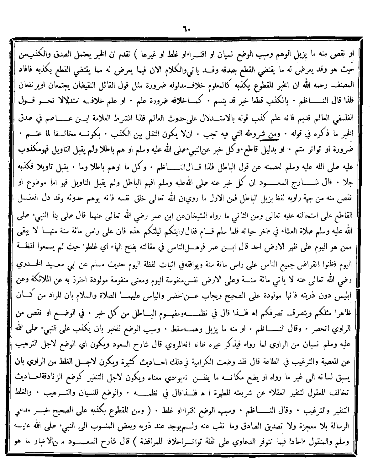 (وَمِنْ الْمَقْطُوعِ بِكَذِبِهِ عَلَى الصَّحِيحِ خَبَرُ مُدَّعِي الرِّسَالَةِ بِلَا مُعْجِزَةٍ أَوْ تَصْدِيقِ الصَّادِقِ وَمَا نُقِّبَ عنه وَلَمْ يُوجَدْ عِنْدَ ذويه وبعض المنسوب الى النبيء صلى الله عليه وسلم وَالْمَنْقُولُ آحَادٌ فِيمَا تَتَوَفَّرُ الدَّوَاعِي عَلَى نَقْلِهِ خِلَافًا لِلرَّافِضَةِ) قال شارح السعود من الاخبار ما هو