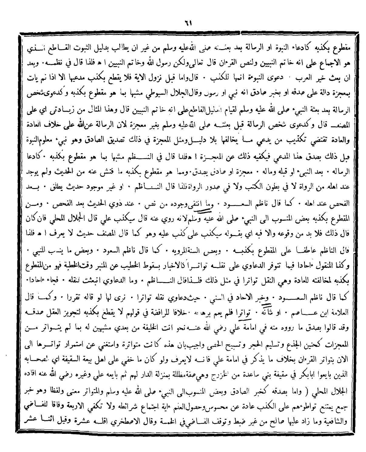 مقطوع بكذبه كادعاء النبوة او الرسالة بعد بعثته صلى الله عليه وسلم من غير ان يطالب بدليل الثبوت القاطع الذى هوالاجماع على انه خاتم النبيين ولنص القرءان قال تعالى ولكن رسول الله وخاتم النبيين اهـ فلذا قال فى نظمه: