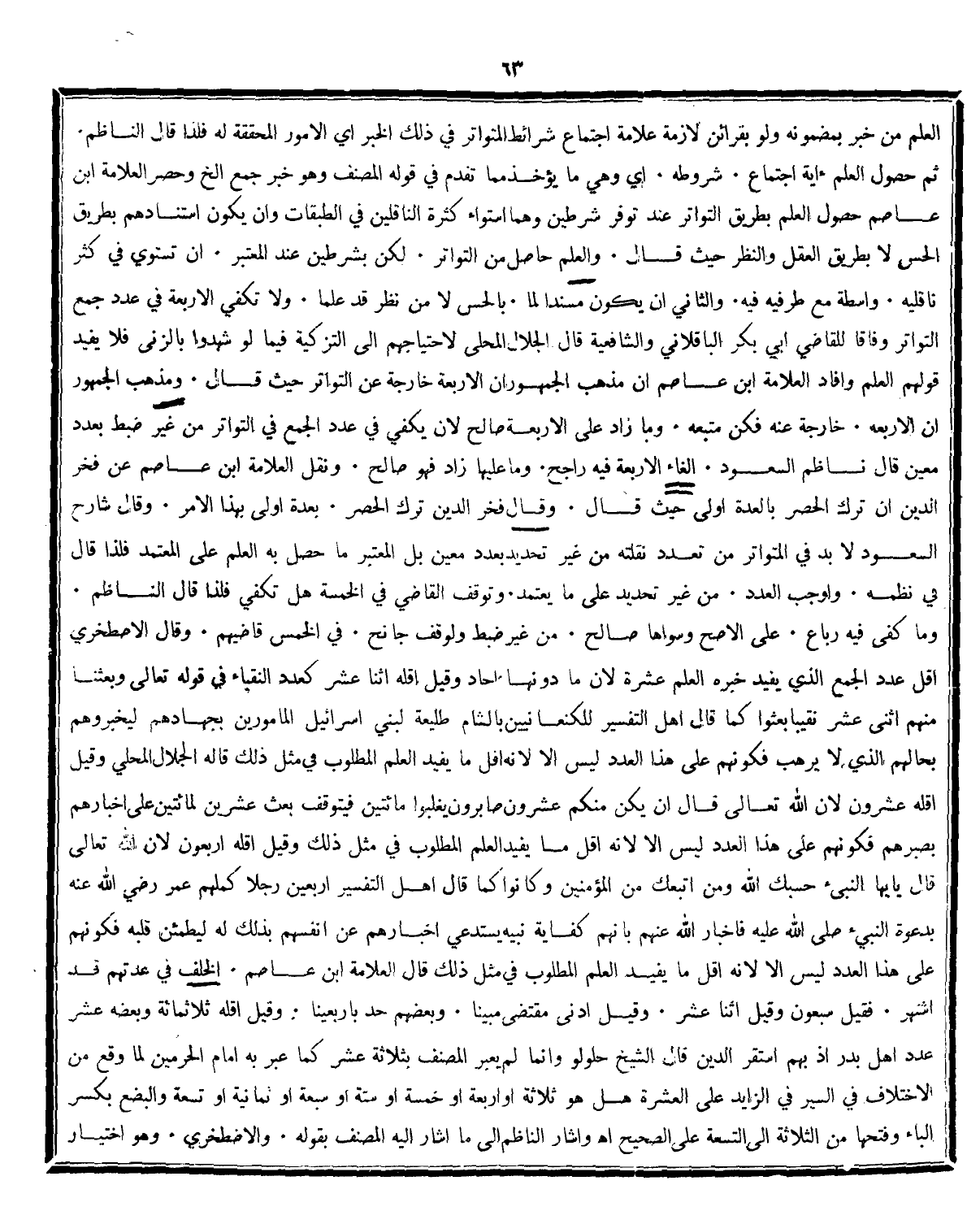 العلم من خبر بمضمونه ولو بقرائن لازمه علامة اجتماع شرائط المتواتر في ذلك الخبر اي الامور المحققة له فلذا قال الناظم ثم حصول العلم ءاية اجتماع شروطه اي وهي ما يؤخذ مما تقدم فى قوله المصنف وهو خبر جمع الخ وحصر العلامة ابن عاصم حصول العلم بطريق التواتر عند توفر شرطين وهما استواء كثرة الناقلين في الطبقات وان يكون استنادهم بطريق الحس لا بطريق العقل والنظر حيث قال والعلم حاصل من التواتر لكن بشرطين عند المعتبر ان تستوي في كثر ناقليه واسطة مع طرفيه فيه والثاني ان يكون مسندا لما بالحس لا من نظر قد علما ولا تكفي الاربعة في عدد جمع التواتر وفاقا للقاضي ابي بكر الباقلاني والشافعية قال الجلال المحلى لاحتياجهم الى التزكية فيما لو شهدوا بالزنى فلا يفيد قولهم العلم وافاد العلامة ابن عاصم ان مذهب الجمهور ان الاربعة خارجة عن التواتر حيث قال ومذهب الجمهور ان