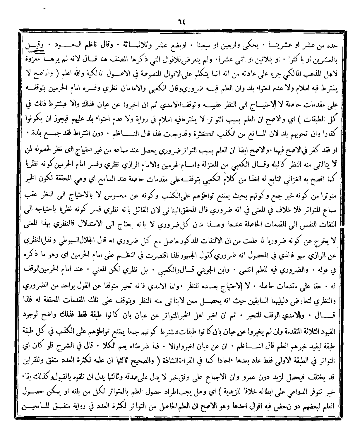 باحتياجه الى انتفات النفس الى المقدمات الحاصلة عندها وهذا شان كل ضروري لا بانه يحتاج الى الاستدلال فالنظري بهذا المعنى لا يخرج عن كونه ضروريا لما علمت من ان الالتفات المذكور حاصل مع كل ضروري اهـ قال الجلال السيوطي ونقل النظري عن الرازي سهو فالذي في المحصول انه ضروري كقول الجمهور فلذا اقتصرت في النظم على امام الحرمين اي وهو ماذكره فى قوله والضروري فيه للعلم اتتمى وابن الجويني قال والكعبي بل نظري لكن المعنى عند امام الحرمين الوقف له حقا على مقدمات حاصلة لا الاحتياج بعده للنظر واما الامدي فانه تحير متوقفا عن القول بواحد من الضروري والنظري لتعارض دليليهما السابقين حيث انه يحصل ممن لا يتاتى منه النظر ويتوقف على تلك المقدمات المحققة له فلذا قال والامدي الوقف للتحير ثم ان اخبر اهل الخبر المتواتر عن عيان بان كانوا طبقة فقط فذلك واضح لوجود القيود الثلاثة المتقدمة وان لم يخبروا عن عيان بان كانوا طبقات فيشترط كونهم جمعا يمتنع تواطؤهم على الكذب في كل طبقة طبقة ليفيد خبرهم العلم قال الناظم ان عن عيان اخبروا والا فما شرطناه يعم الكلا قال في الشرح فلو كان اي التواتر في الطبقة الاولى فقط عاد بعدها ءاحادا كما في القراءة الشاذة والصحيح ثالثها ان علمه لكثرة العدد متفق وللقراين قد يختلف فيحصل لزيد دون عمرو وان الاجماع على وفق خبر لا يدل على صدقه وثالثها يدل ان تلقوه بالقبول وكذلك بقاء خبر تتوفر الدواعي على ابطاله خلاا للزيدية اي وهل يجب اطراد حصول العلم بالمتواتر لكل من بلغه او يمكن حصول العلم لبعضهم دون بعض فيه اقوال احدها وهوالاصح ان العلم الحاصل من التواتر لكثرة العدد في رواية متفق للسامعين