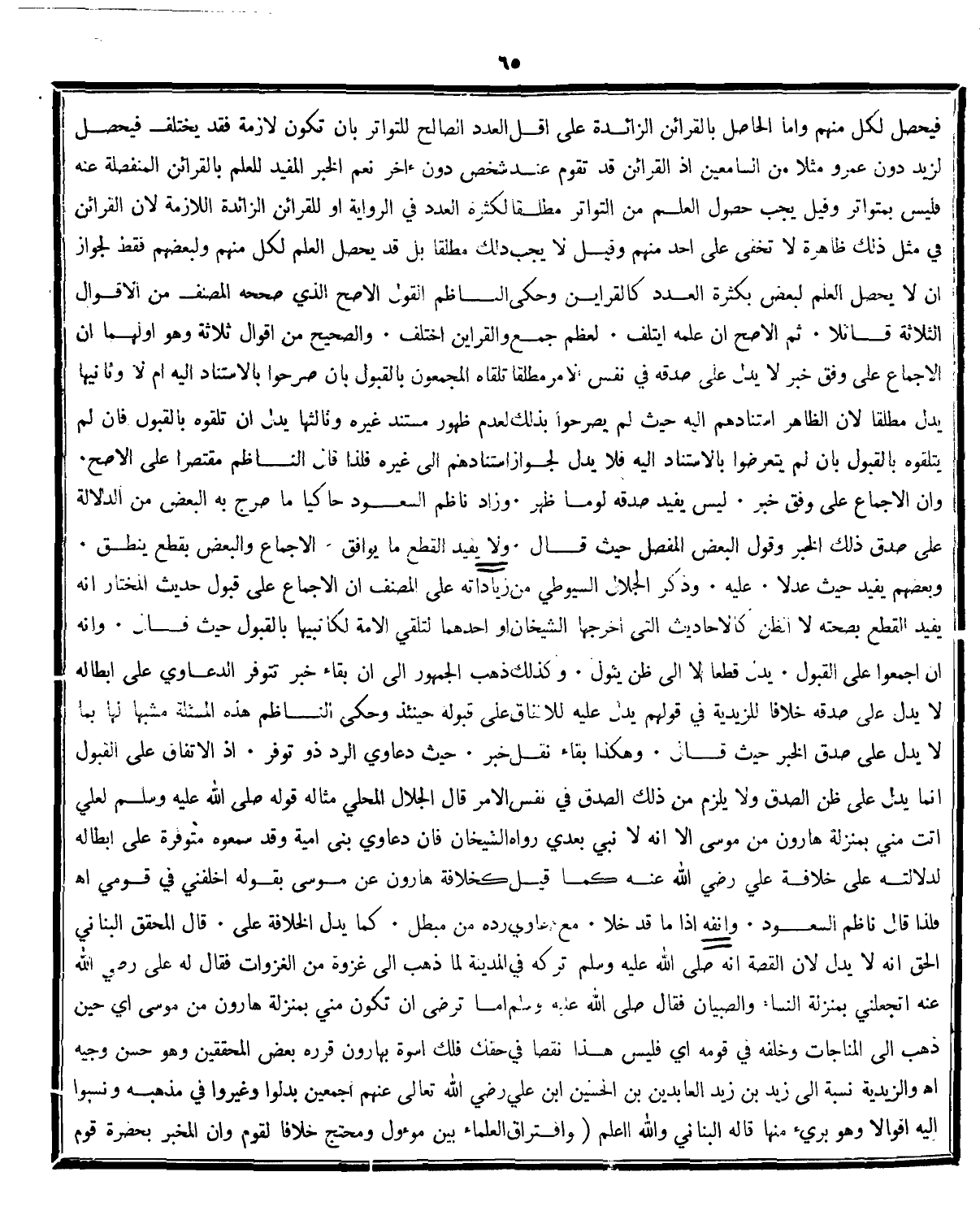 بمنزلة هارون من موسى الا انه لا نبي بعدي رواه الشيخان فان دعاوي بنى امية وقد سمعوه متوفرة على ابطاله لدلالته على خلافة علي رضي الله عنه كما قيل كخلافة هاورن عن موسى بقوله اخلفني في قومي اهـ فلذا قال ناظم السعود وانفه اذا ما قد خلا مع دعاوي رده من مبطل كما يدل لخلافة على قال المحقق البناني الحق انه لا يدل لان القصة انه صلى الله عليه وسلم تركه في المدينة لما ذهب الى غزوة من الغزوات فقال له على رضي الله عنه اتجعلني بمنزلة النساء والصبيان فقال صلى الله عليه وسلم اما ترضى ان تكون مني بمنزلة هارون من موسى اي حين ذهب الى المناجات وخلفه في قومه اي فليس هذا نقصا في حقك فلك اسوة بهارون قرره بعض المحققين وهو حسن وجيه اهـ والزيدية نسبة الى زيد بن زين العابدين بن الحسين ابن علي رضي الله تعالى عنهم اجمعين بدلوا وغيروا في مذهبه ونسبوا اليه اقوالا وهوبريء منها قاله البناني والله اعلم وافترق العلماء بين مؤول ومحتج خلافا لقوم وان المخبر بحضرة قوم