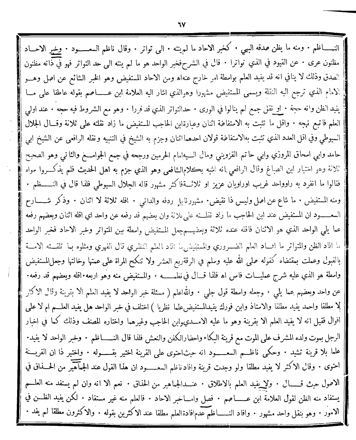 الناظم ومنه ما يظن صدقه البهي كخبر الاحاد ما لم ينته الى تواتر وقال ناظم السعود وخبر الاحاد مظنون عرى عن القيود في الذي تواترا قال في الشرح فخبر الواحد هو ما لم ينته الى حد التواتر فهو في ذاته مظنون الصدق وذلك لا ينافي انه قد يفيد العلم بواسطة امر خارج عنه اهـ ومن الاحاد المستفيض وهو الخبر الشائع عن اصل وهو الامام الذي ترجع اليه النقلة ويسمى المستفيض مشهورا وهوالذي اشار اليه العلامة ابن عاصم بقوله عاطفا على ما يفيد الظن وانه حجة او نقل جمع لم ينالوا في الورى حد التواتر الذي قد فررا وهومع الشروط فيه حجه عند اولي العلم فاتبع نهجه واقل ما تثبت به الاستفاضة اثنان وعبارة ابن الحاجب المستفيض ما زاد نقلته على ثلاثة وقال الجلال السيوطي وفي اقل العدد الذي تثبت به الاستفاضة قولان احدهما اثنان وجزم به الشيخ في التنبيه ونقله الرافعى عن الشيخ ابى حامد وابي اسحاق المروزي وابي حاتم القزويني ومال اليه امام الحرمين ورجحه في جمع الجوامع والثاني وهو الصحيح ثلاثة وهو اختيار ابن الصباغ وقال الرافعي انه اشبه بكلام الشافعى وهو الذي جزم به اهل الحديث فلم يذكروا سواه فقالوا ما انفرد به راو واحد غريب او راويان عزيز او ثلاثة فاكثر مشهور قاله الجلال السيوطي فلذا قال في النظم ومنه المستفيض ما شاع عن اصل وليس ذا نقيض مشهورنا بل ردفه والداني اقله ثلاثة لا اثنان وذكر شارح السعود ان المستفيض عند ابن الحاجب ما زاد نقلته على ثلاثة وان بعضهم قد رفعه عن واحد اي اقله اثنان وبعضهم رفعه عما يلي الواحد الذي هو الاثنان فاقله عنده