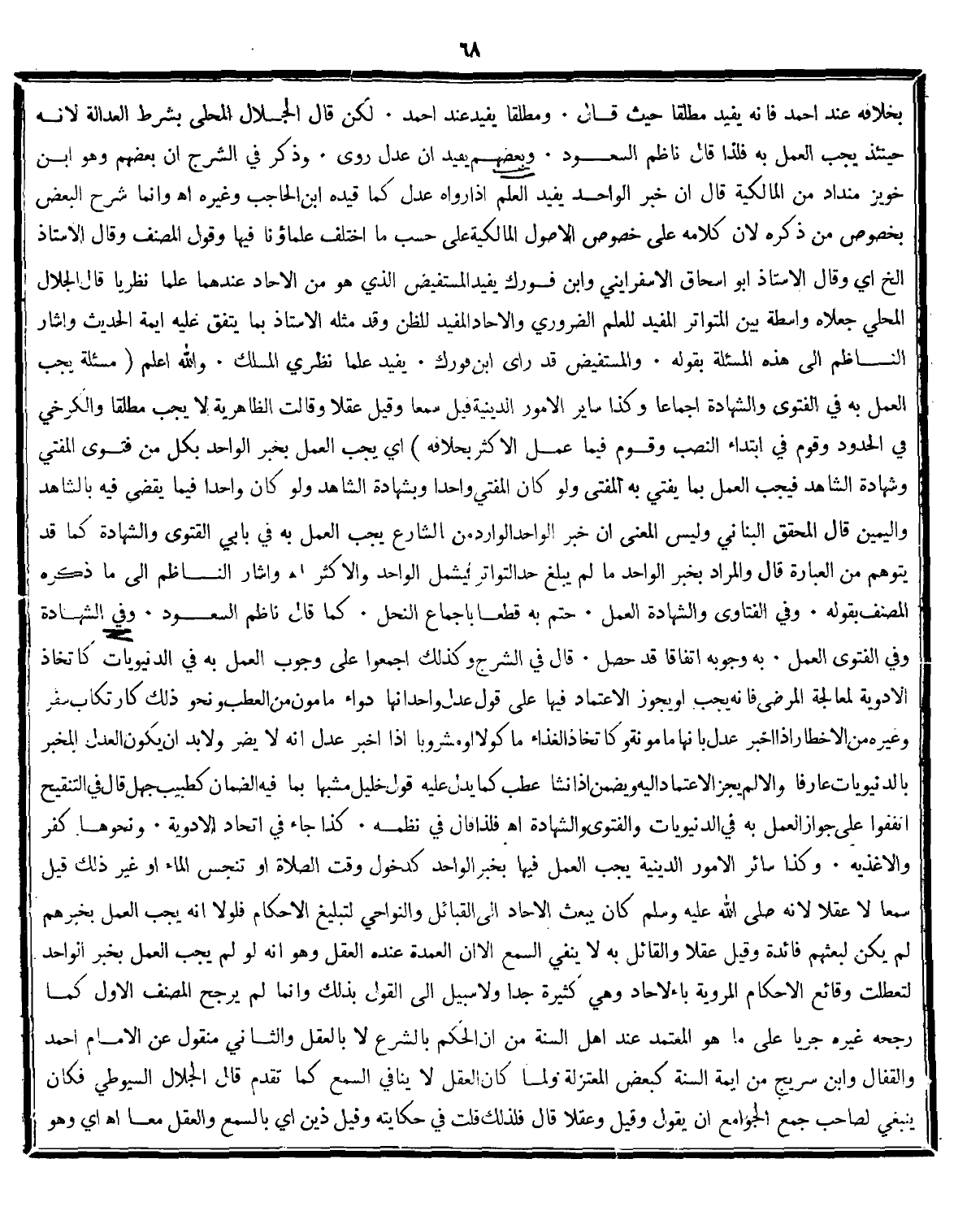 رواه عدل كما قيده ابن الحاجب وغيره اهـ وانما شرح البعض بخصوص من ذكره لان كلامه على خصوص الاصول المالكية على حسب ما اختلف علماؤنا فيها وقول المصنف وقال الاستاذ الخ اي وقال الاستاذ ابو اسحاق الاسفرايني وابن فورك يفيد المستفيض الذي هو من الاحاد عندهما علما نظريا قال الجلال المحلي جعلاه واسطة بين المتواتر المفيد للعلم الضروري والاحاد المفيد للظن وقد مثله الاستاذ بما يتفق عليه ايمة الحديث واشار الناظم الى هه المسئلة بقوله والمستفيض قد راى ابن فورك يفيد علما نظري الملك والله اعلم مسئلة يجب العمل به الفتوى والشهادة اجماعا وكذا ساير الامور الدينية قبل سمعا وقيل عقلا وقالت الظاهرية لا يجب مطلقا والكرخي في الحدود وقوم في ابتداء النصب وقوم فيما عمل الاكثر بخلافه اي يجب العمل بخبر الواحد بكل من فتوى المفتي وشهادة الشاهد فيجب العمل بما يفتي به المفتى ولو كان المفتي واحدا وبشهادة الشاهد ولو كان واحدا فيما يقضي فيه بالشاهد واليمين قال المحقق البناني وليس المعنى ان خبر الواحد الوارد من الشارع يجب العمل به في بابي الفتوى والشهادة كما قد يتوهم من العبارة قال والمراد بخبر الواحد ما لم يبلغ حد التواتر فيشمل االواحد والاكثر اهـ واشار الناظم الى ما ذكره المصنف بقوله وفي الفتاوى والشهادة العمل ختم به قطعا باجماع النحل كما قال ناظم السعود وفي الشهادة وفي الفتوى العمل به وجوبه اتفاقا قد حصل قال في الشرح وكذلك اجمعوا على وجوب العمل به في الدنيويات كاتخاذ الادوية لمعالجة المرضى فانه يجب او يجوز الاعتماد فيها على قول عدل واحد انها دواء مامون من العطب ونحو ذلك كارتكاب سفر وغيره من الاخطار اذا اخبر عدل بانها مامونة وكاتخاذ الغذاء ماكولا او مشروبا اذا اخبر عدل انه لا يضر ولابد ان يكون العدل المخبر بالدنيويات عارفا والا لم يجز الاعتماد اليه ويضمن اذا نشا عطب كما يدل عليه قول خليل مشبها بما فيه الضمان