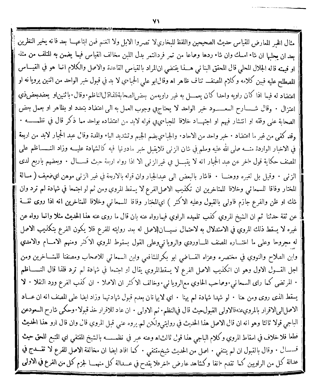 المعارض للقياس حديث الصحيحين واللفظ للبخاري لا تصروا الابل ولا الغنم فمن ابتاعها بعد فانه يخير النظرين بعد ان يجلبها ان شاء امسك وان شاء ردها وصاعا من تمر بدل اللبن مخالف القياس فيما يضمن به المتلف من مثله او قيمته قاله الجلال المحلي قال المحقق البناني هذا يقتضي ان المراد بالقياس القاعدة والاصل والكلام انما هو في القياس المصطلح عليه فبين كلامه وكلام المصنف تناف ظاهر اهـ وقال ابو علي الجباءي لابد في قول خبر الواحد من اثنين يرويانه او اعتضاد له فيما اذا كان راويه واحدا كان يعمل به غير راويه من بعض الصحابة فلذا قال الناظم وقال باثنين او يعضد بعض ذي اعتزال وقال شارح السعود خبر الواحد لا يحتاج في وجوب العمل به الى اعتضاد بتعدد او بظاهر او بعمل بعض الصحابة على وقفه او انتشار فيهم او اجتهاد خلافا للجباءي في قوله لابد من اعتضاده بواحد مما ذكر قال في نظمه وقد كفى من غير ما اعتضاد خبر واحد من الاحاد والجباءي بضم الجيم وتشديد الباء والمدة وقال عبد الجبار لابد من اربعة في الاخبار الواردة منه صلى الله عليه وسلم في شان الزنى فلا يقبل خبر مادونها فيه كالشهادة عليه وزاد الناظم على المصنف حكاية قول ءاخر عن عبد الجبار انه لايقبل في غير الزنى الا اذا رواه اربعة حيث قال وبعضهم باربع لدى الزنى وقيل بل لغيره ووهنا فاشار بالبعض الى عبد الجبار وان قوله بالاربعة في غير الزنى موهن أي ضعيف مسالة المختار وفاقا للسمعاتي وخلافا للمتاخرين ان تكذيب الاصل الفرع لا يسقط المروي ومن ثم لو اجتمعا في شهادة لم ترد وان شك او ظن والفرع جازم فاولى بالقبول وعليه الاكثر أي المختار وفاقا للسمعاني وخلافا للمتاخرين انه اذا روى ثقة عن ثقة حدثنا ثم ان الشيخ المروي كذب تلميذه الراوي فيما رواه عنه بان قال ما روى عنه هذا الحديث مثلا وانما رواه عن غيره لا يسقط ذلك المروي في الاستدلال به لاحتمال نسيان الاصل له بعد روايته