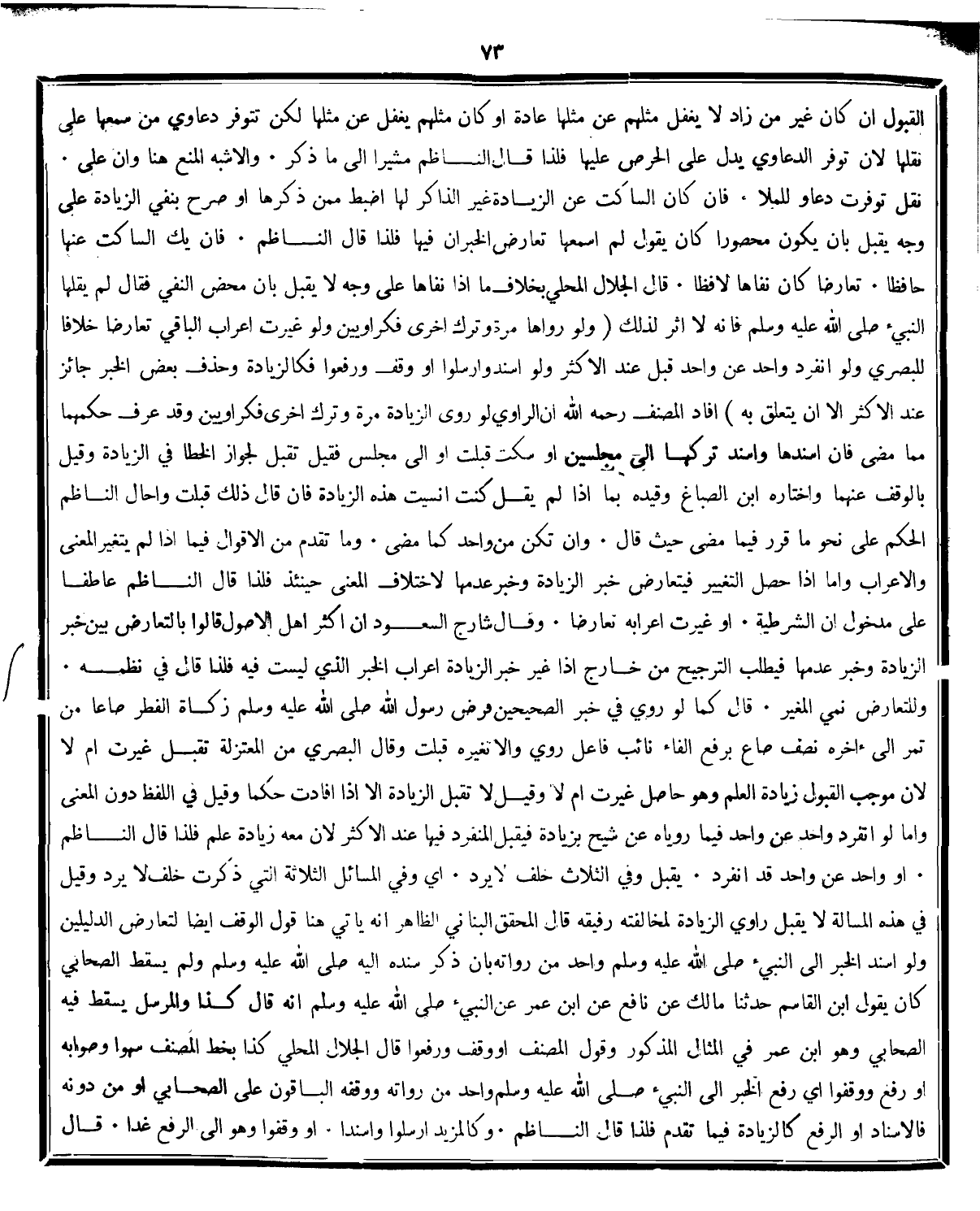 ابن الصباغ وقيده بما اذا لم يقل كنت انسيت هذه الزيادة فان قال ذلك قبلت واحال الناظم الحكم على نحو ما قرر فيما مضى حيث قال وان تكن من واحد كما مضى وما تقدم من الاقوال فيما ذا لم يتغير المعنى والاعراب واما اذا حصل التغيير فيتعارض خبر الزيادة وخبر عدمها لاختلاف المعنى حينئذ فلذا قال الناظم عاطفا على مدخول ان الشرطية او غيرت اعرابه تعارضا وقال شارح السعود ان اكثر اهل الاصول قالوا بالتعارض بين خبر على الزيادة وخبر عدمها فيطلب الترجيح من خارج اذا غير خبر الزيادة اعراب الخبر الذي ليست فيه فلذا قال في نظمه وللتعارض نمي المغير قال كما روي في خبر الصحيحين فرض رسول الله صلى الله عليه وسلم زكاة الفطر صاعا من تمر الى ءاخره نصف صاع برفع الفاء نائب فاعل روي والا تغيره قبلت وقال البصري من المعتزلة تقبل غيرت ام لا لان موجب القبول زيادة العلم وهو حاصل غيرت ام لا وقيل لا تقبل الزيادة الا اذا افادت حكما وقيل في اللفظ دون المعنى واما لو انفرد واحد عن واحد فيما روياه عن شيخ بزيادة فيقبل المنفرد فيها عند الاكثر لان معه زيادة علم فلذا قال الناظم او واحد عن واحد قد انفرد يقبل وفي الثلاث خلف لا يرد أي وفي المسائل الثلاثة التي ذكرت خلف لا يرد وقيل في هذه المسالة لا يقبل راوي الزيادة لمخالفته رفيقه قال المحقق البناني الظاهر انه ياتي هنا قول الوقف ايضا لتعارض الدليلين ولو اسند الخبر الى النبيء صلى الله عليه وسلم واحد من رواته بان ذكر سنده اليه صلى الله عليه وسلم ولم يسقط الصحابي كان يقول ابن القاسم حدثنا مالك عن نافع عن ابن عمر عن النبيء صلى الله عليه وسلم انه قال كذا والمرسل يسقط فيه الصحابي وهو ابن عمر في المثال المذكور وقول المصنف او وقف ورفعوا قال الجلال المحلي كذا بخط المصنف سهوا وصوابه اورفع ووقفوا أي رفع الخبر الى النبيء صلى الله عليه وسلم واحد من رواته ووقفه الباقون على الصحابي او من دونه