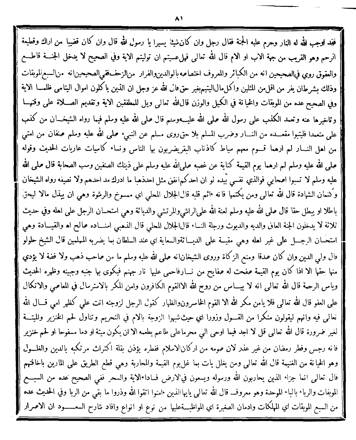فقد اوجب الله له النار وحرم عليه الجنة فقال رجل وان كان شيئا يسيرا يا رسول الله قال وان كان قضيبا من اراك وقطيعة الرحم وهو القريب من جهة الاب او الام قال الله تعالى فهل عسيتم ان توليتم الاية وفي الصحيح لا يدخل الجنة قاطع والعقوق روي في الصحيحين انه من الكبائر والمعروف اختصاصه بالوالدين والفرار من الزحف ففي الصحيحين انه من السبع الموبقات وذلك بشرطان يفر من اقل من المثلين واكل ما اليتيم بغير حق قال الله عز وجل ان الذين ياكلون اموال اليتامى ظلما الاية وفي الصحيح عده من الموبقات والخيانة في الكيل والوزن قال الله تعالى ويل للمطففين الاية وتقديم الصلاة على وقتها وتاخيرها عنه وتعمد الكذب على رسول الله صلى الله عليه وسلم قال صلى الله عليه وسلم فيما رواه الشيخان من كذب على متعمدا فليتبوا مقعده من النار وضرب المسلم بلا حق روى مسلم عن النبيء صلى الله عليه وسلم صنفان من امتي من اهل النار لم ارهما قوم معهم سياط كاذناب البقر يضربون بها الناس ونساء كاسيات عاريات الحديث وقوله صلى الله عليه وسلم لم ارهما يوم القيمة كناية عن غضبه صلى الله عليه وسلم على ذينك الصنفين وسب الصحابة قال صلى الله عليه وسلم لا تسبوا اصحابي فوالذي نفسي بيده لو ان احدكم انفق مثل احد ذهبا ما ادرك مد احدهم
