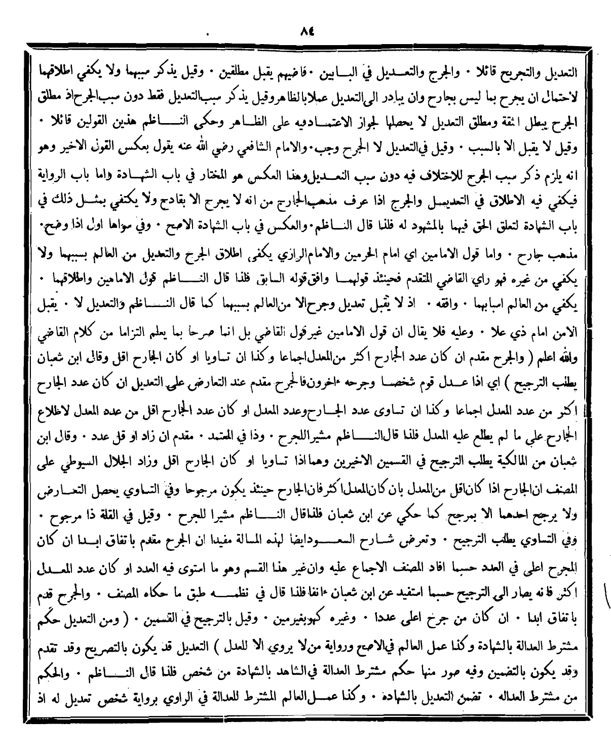 وعليه فلا يقال ان قول الامامين غير قول القاضي بل انما صرحا بما يعلم التزاما من كلام القاضي والله اعلم والجرح مقدم ان كان عدد الجارح اكثر من المعدل اجماعا وكذا ان تساويا او كان الجارح اقل وقال ابن شعبان يطلب الترجيح أي اذا عدل قوم شخصا وجرحه ءاخرون فالجرح مقدم عند التعارض على التعديل ان كان عدد الجارح اكثر من عدد المعدل اجماعا وكذا ان تساوى عدد الجارح وعدد المعدل او كان عدد الجارح اقل من عدد المعدل لاطلاع الجارح على ما لم يطلع عليه المعدل فلذا قال الناظم مشيرا للجرح وذا في المعتمد مقدم ان زاد او اقل عدد وقال ابن شعبان من المالكية يطلب الترجيح في القسمين الاخيرين وهما اذا تساويا او كان الجارح اقل وزاد الجلال السيوطي على المصنف ان الجارح اذا كان اقل من المعدل بان كان المعدل اكثر فان الجارح حينئذ يكون مرجوحا وفي التساوي يحصل التعارض ولا يرجح احدهما الا بمرجح كما حكي عن ابن شعبان فلذا قال الناظم مشيرا للجرح وقيل في القلة ذا مرجوح وفي التساوي يطلب الترجيح وتعرض شارح السعود ايضا لهذه المسالة مفيدا ان الجرح مقدم باتفاق ابدا ان كان المجرح اعلى في العدد حسبما افاد المصنف الاجماع عليه وان غير هذا القسم وهو ما استوى فيه العدد او كان عدد المعدل اكثر فانه يصار الى الترجيح حسبما استفيد عن ابن شعبان ءانفا فلذا قال في نظمه طبق ما حكاه المصنف والجرح قدم باتفاق ابدا ان كان من جرح العى عددا وغيره كهو بغيرمين وقيل بالترجيح في القسمين ومن التعديل حكم مشترط العدالة بالشهادة وكذا عمل العالم في الاصح ورواية من لا يروي الا للعدل التعديل قد يكون بالتصريح وقد تقدم وقد يكون بالتضمين وفيه صور منها حكم مشترط العدالة في الشاهد