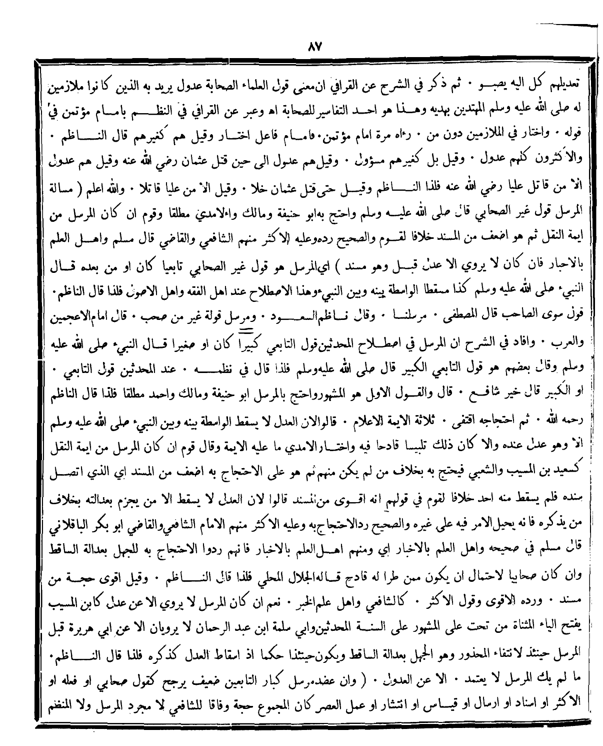 تعديلهم كل اليه يصبو ثم ذكر في الشرح عن القرافي ان معنى قول العلماء الصحابة عدول يريد به الذين كانوا ملازمين له صلى الله عليه سلم المهتدين بهديه هذا هو احد التفاسير للصحابة اهـ وعبر عن القرافي في النظم بامام مؤتمن في قوله واختار في الملازمين دون من رءاه مرة امام مؤتمن فامام فاعل اختار وقيل هم كغيرهم قال الناظم والاكثرون كلهم عدول وقيل بل كغيرهم مسؤول وقيل هم عدول الى حين قتل عثمان رضي الله عنه وقيل هم عدول الا من قاتل عليا رضي الله عنه فلذا الناظم وقيل حتى قتل عثمان خلا وقيل الا من عليا قاتلا والله اعلم مسالة المرسل قول غير الصحابي قال صلى الله عليه وسلم واحتج به ابو حنيفة ومالك واءلامدي مطلقا وقوم ان كان المرسل من ايمة النقل ثم هو اضعف من المسند خلافا لقوم والصحيح رده وعليه الاكثر منهم الشافعي والقاضي قال مسلم واهل العلم بالاخبار فان كان لا يروي الا عدل قبل وهو مسند أي المرسل هو قول غير الصحابي تابعيا كان او من بعده قال النبيء صلى الله عليه وسلم كذا مسقطا الواسطة بينه وبين النبيء وهذا الاصطلاح عند اهل الفقه واهل الاصول فلذا قال الناظم قول سوى الصاحب قال المصطفى