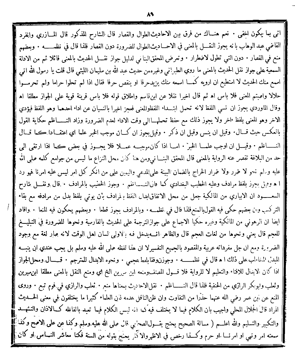 اتى بما يكون اخفى نعم هناك من فرق بين الاحاديث الطوال والقصار قال الشارح المذكور قال المازري وانفرد القاضي عبد الوهاب بانه يجوز النقل بالمعنى في الاحاديث الطوال للضرورة دون القصار فلذا قال في نظمه وبعضهم منع في القصار دون التي تطول لاضطرار وتعرض المحقق البناني لدليل جواز نقل الحديث بالمعنى قائلا ثم من الادلة السمعية على جواز نقل الحديث بالمعنى ما روي الطبراني وغيره من حديث عبد الله بن سليمان الليثي قال قلت يا رسول الله اني اسمع منك الحديث لا استطيع ان