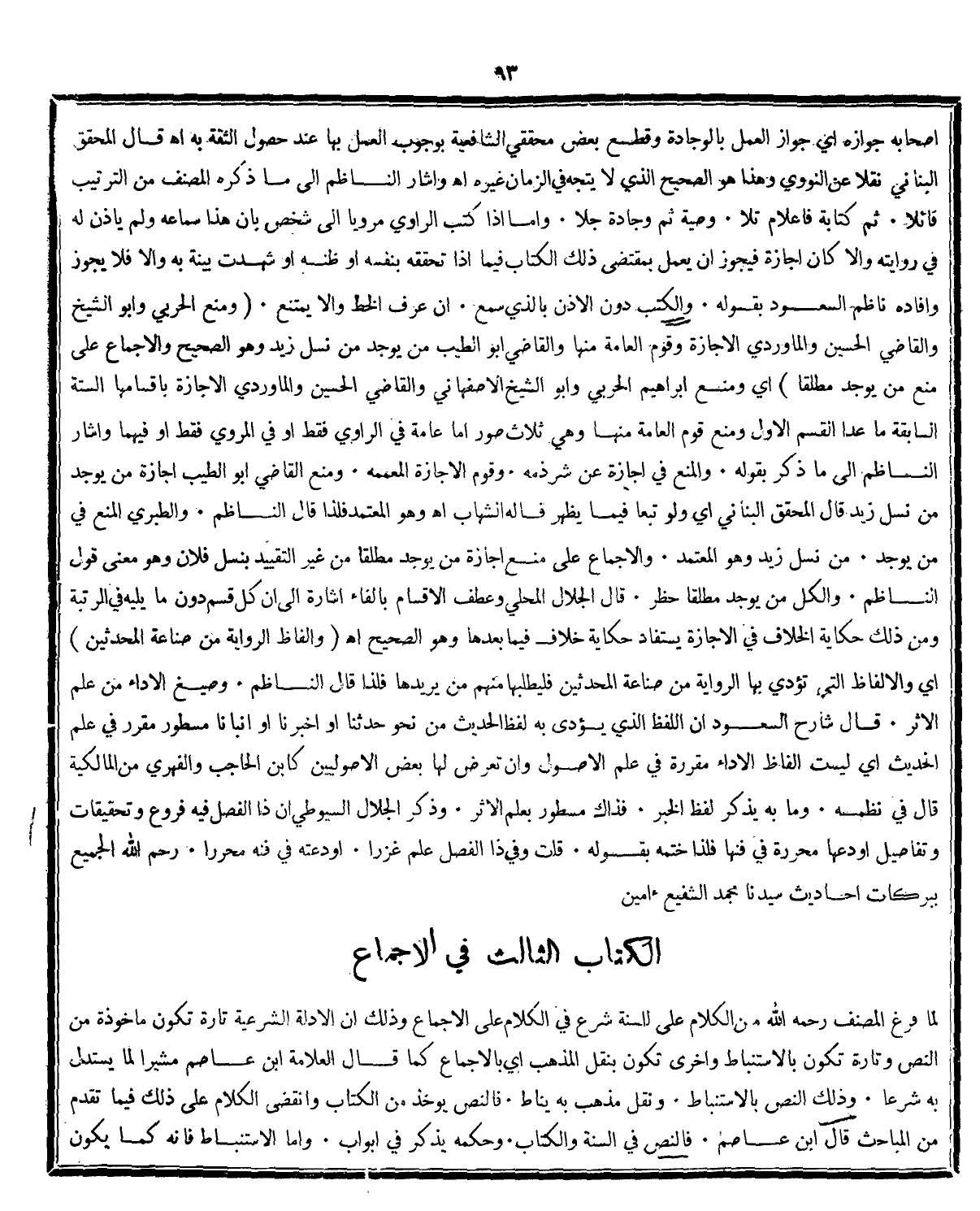 اصحابه جوازه أي جواز العمل بالوجادة وقطع بعض محققي الشافعية بوجوب العمل بها عند حصول الثقة به اهـ قال المحقق البناني نقلا عن النووي وهذا هو الصحيح الذي لا يتجه في الزمان غيره اهـ واشار الناظم الى ما ذكره المصنف من الترتيب قائلا ثم كتابة فاعلام تلا وصية ثم وجادة جلا واما اذا كتب الراوي مرويا الى شخص بان هذا سماعه ولم ياذن له في روايته والا كان اجازة فيجوز ان يعمل بمقتضى ذلك الكتاب فيما اذا تحققه بنفسه او ظنه او شهدت بينة به والا فلا يجوز وافاده ناظم السعود بقوله والكتب دون الاذن بالذي سمع ان عرف الخط والا يمتنع ومنع الحربي وابو الشيخ والقاضي الحسين والماوردي الاجازة وقوم العامة منها والقاضي ابو الطيب من يوجد من نسل زيد وهو الصحيح والاجماع على منع من يوجد مطلقا أي ومنع ابراهيم الحربي وابو الشيخ الاصفهاني والقاضي الحسين والماوردي الاجازة باقسامها الستة السابقة ماعدا القسم الاول ومنع قوم العامة منها وهي ثلاث صور اما عامة في الراوي فقط او في المروي فقط او فيهما واشار الناظم الى ماذكر بقوله والمنع في اجازة عن شر ذمه وقوم الاجازة المعممه ومنع القاضي ابو الطيب اجازة من يوجد من