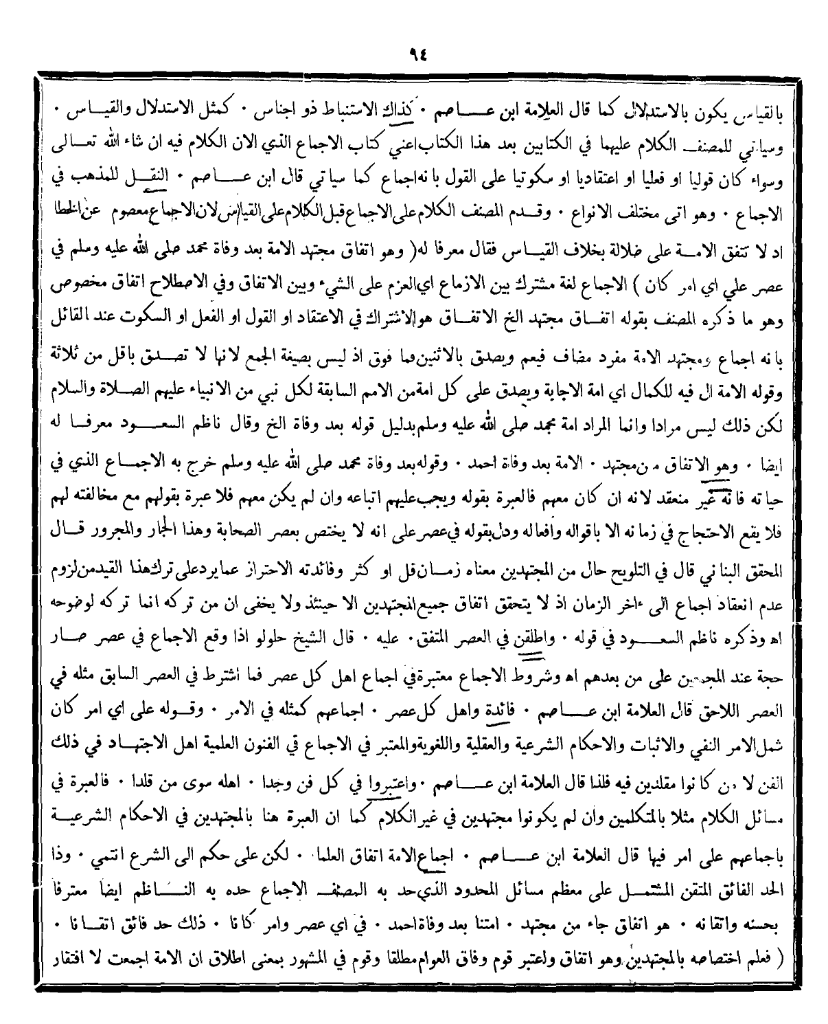 اللاحق قال العلامة ابن عاصم فائدة واهل كل عصر اجماعهم كمثله في الامر وقوله على أي امر كان شمل الامر النفي والاثبات والاحكام الشرعية والعقلية واللغوية والمعتبر في الاجماع في الفنون العلمية اهل الاجتهاد في ذلك الفن لا من كانوا مقلدين فيه فلذا قال العلامة ابن عاصم واعتبروا في كل فن وجدا اهله سوى من قلدا فالعبرة في مسائل الكلام مثلا بالمتكلمين وان لم يكونوا مجتهدين في غير الكلام كما ان العبرة هنا بالمجتهدين في الاحكام الشرعية باجماعهم على امر فيها قال العلامة ابن عاصم اجماع الامة اتفاق العلماء لكن على حكم الى الشرع انتمي وذا الحد الفائق المتقن المشتمل على معظم مسائل المحدود الذي حد به المصنف الاجماع حده به الناظم ايضا معترفا بحسنه واتقانه هو اتفاق جاء من مجتهد امتنا بعد وفاة احمد في أي عصر وامر كانا ذلك حد فائق اتفاقا فعلم اختصاصه بالمجتهدين وهو اتفاق واعتبر قوم وفاق العوام مطلقا وقوم في المشهور بمعنى اطلاق ان الامة اجمعت لا افتقار