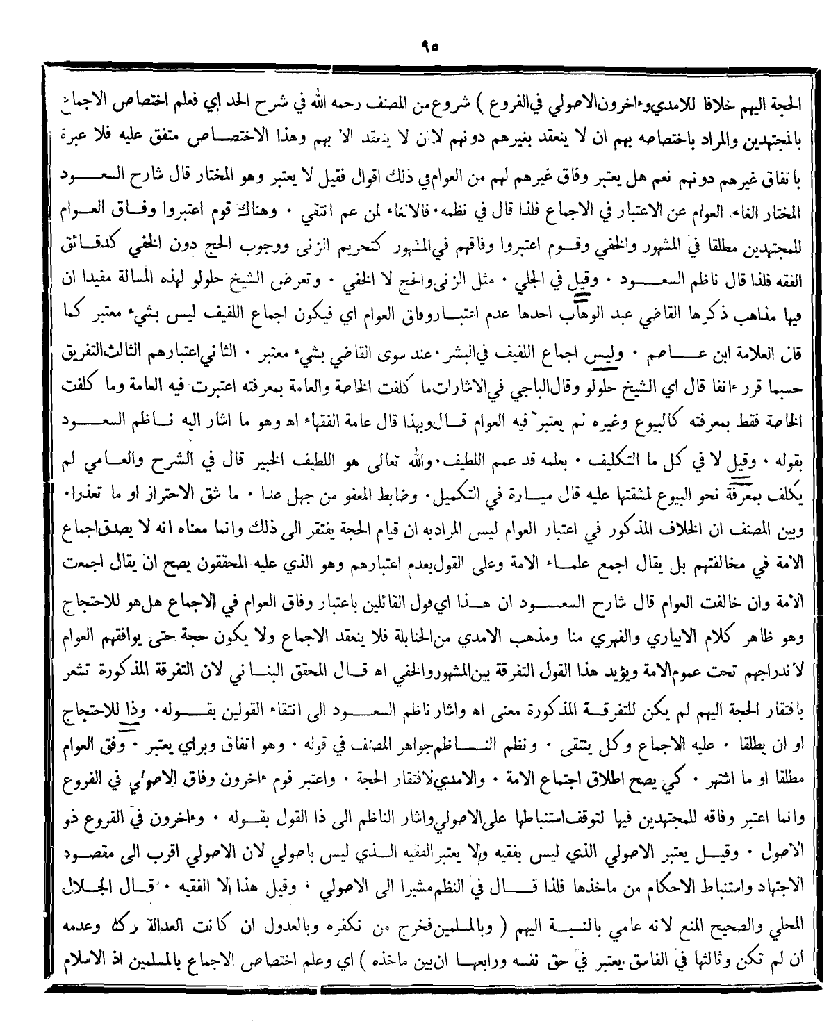 الحجة اليهم خلافا للامدي وءاخرون الاصولي في الفروع شروع من المصنف رحمه الله في شرح الحد أي فعلم اختصاص الاجماع بالمجتهدين والمراد باختصاصه بهم ان لا ينعقد بغيرهم دونهم لان لاينعقد الا بهم وهذا الاختصاص متفق عليه فلا عبرة باتفاق غيرهم دونهم نعم هل يعتبر وفاق غيرهم لهم من العوام في ذلك اقوال فقيل لا يعتبر وهو المختار قال شارح السعود المختار الغاء العوام عن الاعتبار في الاجماع فلذا قال في نظمه فالالغاء لمن عم انتقي وهناك قوم اعتبروا وفاق العوام للمجتهدين مطلقا في المشهور والخفي وقوم اعتبروا وفاقهم في المشهور كتحريم الزنى ووجوب الحج دون الخفي كدقائق الفقه فلذا قال ناظم السعود وقيل في الجلي مثل الزنى والحج لا الخفي وتعرض الشيخ حلولو لهذه المسالة مفيدا ان فيها مذاهب ذكرها القاضي عبد الوهاب احدها عدم اعتبار وفاق العوام أي فيكون اجماع اللفيف ليس بشيء