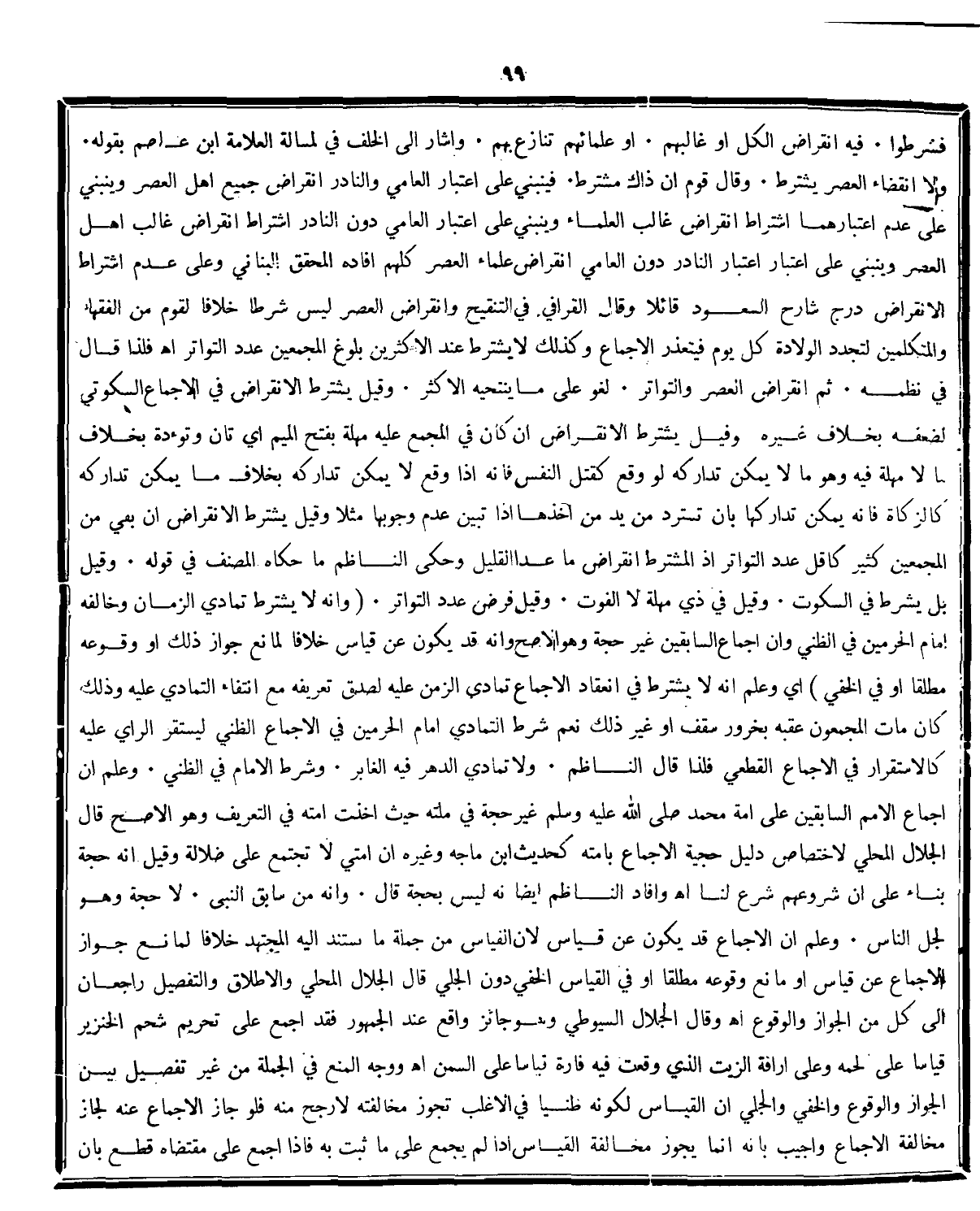 فشرطوا فيه انقراض الكل او غالبهم او علمائهم تنازع بهم واشار الى الخلف في لمسالة العلامة ابن عاصم بقوله ولا انقضاء العصر يشترط وقال قوم ان ذاك مشترط فينبني على اعتبار العامي والنادر انقراض جميع اهل العصر وينبني على عدم اعتبارهما اشتراط انقراض غالب العلماءو ينبني على اعتبار العامي دون النادر اشتراط انقراض غالب اهل العصر وينبني على اعتبار اعتبار النادر دون العامي انقراض علماء العصر كلهم افاده المحقق البناني وعلى عدم اشتراط الانقراض درج شارح السعود قائلا وقال القرافي في التنقيح وانقراض العصر ليس شرطا خلافا لقوم من الفقهاء والمتكلمين لتجدد الولادة كل يوم فيتعذر الاجماع وكذلك لا يشترط عند الاكثرين بلوغ المجمعين عدد التواتر اهـ فلذا قال في نظمه ثم انقراض العصر والتواترلغو على ما ينتحيه الاكثر وقيل يشترط الانقراض في الاجماع السكوتي لضعفه بخلاف غيره وقيل يشترط الانقراض ان كان في المجمع عليه مهلة بفتح الميم أي تان وتؤدة بخلاف ما لا مهلة فيه وهو ما لا يمكن تداركه لو وقع كقتل النفس فانه اذا وقع لا يمكن تداركه بخلاف ما يمكن تداركه كالزكاة فانه يمكن تداركها بان تسترد من يد من اخذها اذا تبين عدم وجوبها مثلا وقيل يشترط الانقراض ان بقي من المجمعين كثير كاقل عدد التواتر اذ المشترط انقراض ما عدا القليل وحكى الناظم ما حكاه المصنف في قوله وقيل بل يشرط في السكوت