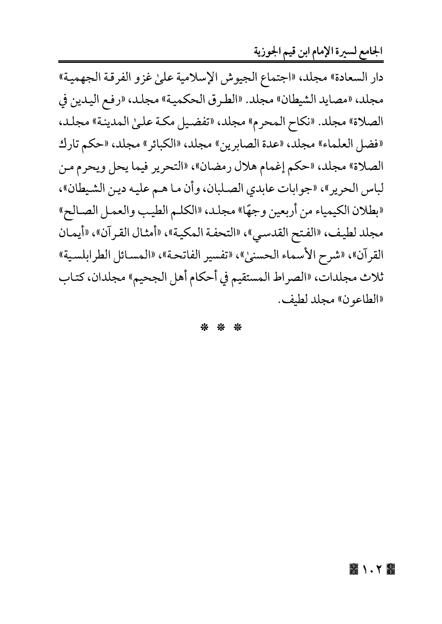 دار السعادة» مجلد، «اجتماع الجيوش الإسلامية على غزو الفرقة الجهمية» مجلد، «مصايد الشيطان» مجلد. «الطرق الحكمية» مجلد، «رفع اليدين في الصلاة» مجلد.
