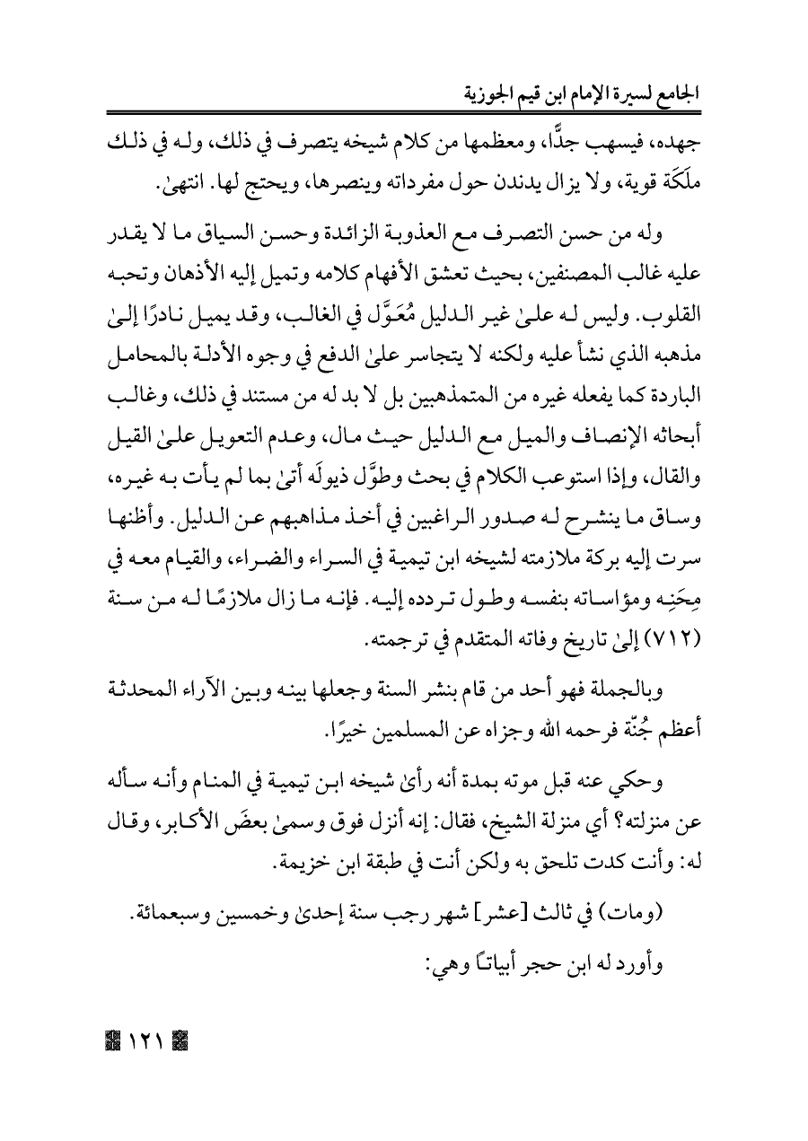 وله من حسن التصرف مع العذوبة الزائدة وحسن السياق ما لا يقدر عليه غالب المصنفين، بحيث تعشق الأفهام كلامه وتميل إليه الأذهان وتحبه القلوب. وليس له على غير الدليل مُعَوَّل في الغالب، وقد يميل نادرًا إلى مذهبه الذي نشأ عليه ولكنه لا يتجاسر على الدفع في وجوه الأدلة بالمحامل الباردة كما يفعله غيره من المتمذهبين بل لا بد له من مستند في ذلك، وغالب أبحاثه الإنصاف والميل مع الدليل حيث مال، وعدم التعويل على القيل والقال، وإذا استوعب الكلام في بحث وطوَّل ذيولَه أتى بما لم يأت به غيره، وساق ما ينشرح له صدور الراغبين في أخذ مذاهبهم عن الدليل. وأظنها سرت إليه بركة ملازمته لشيخه ابن تيمية في السراء والضراء، والقيام معه في مِحَنِه ومؤاساته بنفسه وطول تردده إليه. فإنه ما زال ملازمًا له من سنة (٧١٢) إلى تاريخ وفاته المتقدم في ترجمته.