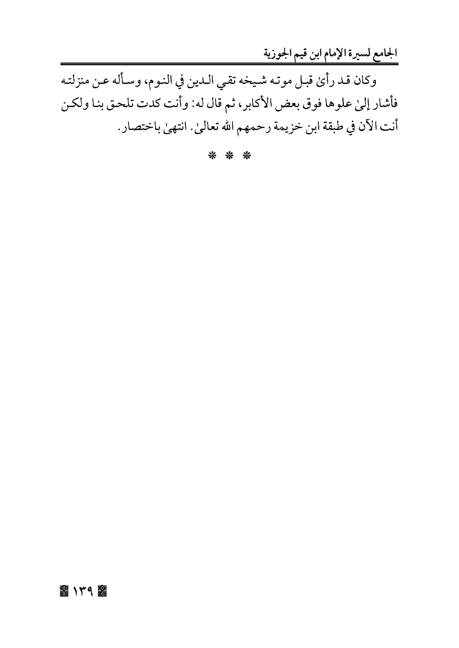 وكان قد رأى قبل موته شيخه تقي الدين في النوم، وسأله عن منزلته فأشار إلى علوها فوق بعض الأكابر، ثم قال له: وأنت كدت تلحق بنا ولكن أنت الآن في طبقة ابن خزيمة رحمهم الله تعالى. انتهى باختصار.