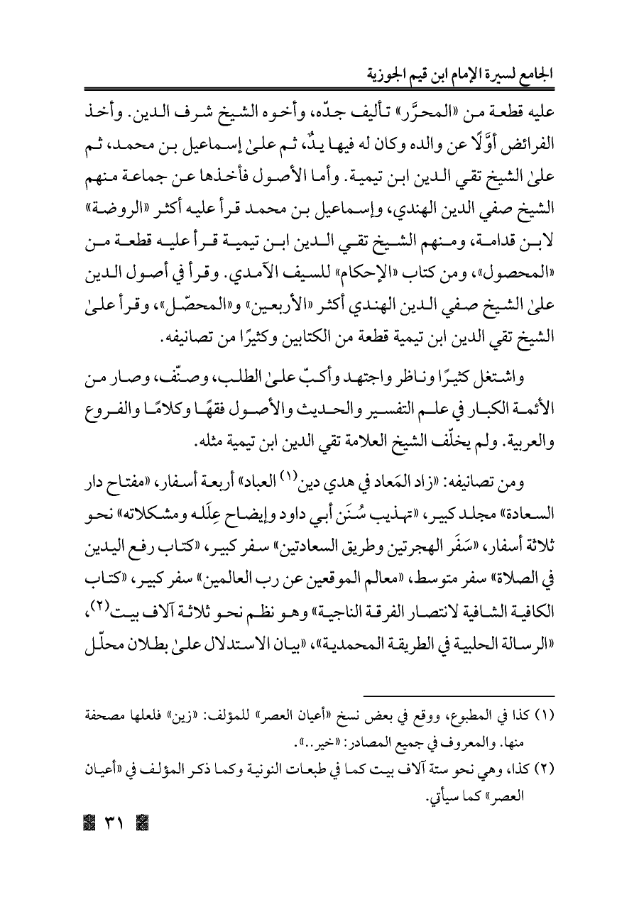 ومن تصانيفه: «زاد المَعاد في هدي دين (¬١) العباد» أربعة أسفار، «مفتاح دار السعادة» مجلد كبير، «تهذيب سُنَن أبي داود وإيضاح عِلَله ومشكلاته» نحو ثلاثة أسفار، «سَفَر الهجرتين وطريق السعادتين» سفر كبير، «كتاب رفع اليدين في الصلاة» سفر متوسط، «معالم الموقعين عن رب العالمين» سفر كبير، «كتاب الكافية الشافية لانتصار الفرقة الناجية» وهو نظم نحو ثلاثة آلاف بيت (¬٢)، «الرسالة الحلبية في الطريقة المحمدية»، «بيان الاستدلال على بطلان محلّل