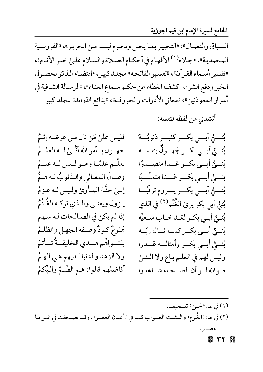 بُنيُّ أبي بكر يروم ترقّيًا ... إلى جنَّة المأوى وليس له عزمُ