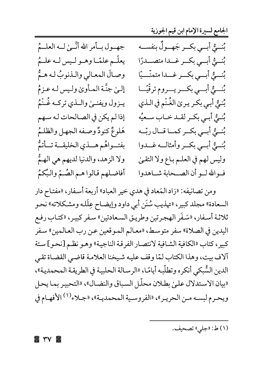 ومن تصانيفه: «زاد المَعاد في هدي خير العباد» أربعة أسفار، «مفتاح دار السعادة» مجلد كبير، «تهذيب سُنَن أبي داود وإيضاح عِلَله ومشكلاته» نحو ثلاثة أسفار، «سَفَر الهجرتين وطريق السعادتين» سفر كبير، «كتاب رفع اليدين في الصلاة» سفر متوسط، «معالم الموقعين عن رب العالمين» سفر كبير، كتاب «الكافية الشافية لانتصار الفرقة الناجية» وهو نظم [نحو] ستة آلاف بيت، وهذا الكتاب لمّا وقف عليه شيخنا العلامة قاضي القضاة تقي الدين السُّبكي أنكره وتطلّبه أيامًا، «الرسالة الحلبية في الطريقة المحمدية»، «بيان الاستدلال على بطلان محلّل السباق والنضال»، «التحبير بما يحل ويحرم لبسه من الحرير»، «الفروسية المحمدية»، «جلاء (¬١) الأفهام في