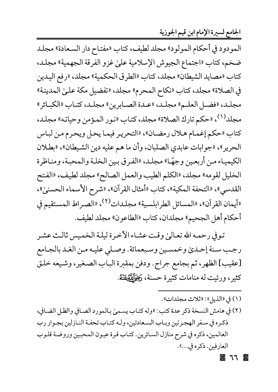 (¬٢) في هامش النسخة ذكر عدة كتب: «وله كتاب يسمى بالمورد الصافي والظل الضافي، ذكره في سفر الهجرتين وباب السعادتين، وله كتاب تحفة النازلين بجوار رب العالمين، ذكره في شرح منازل السائرين. كتاب قرة عيون المحبين وروضة قلوب العارفين. ذكره في ... ».