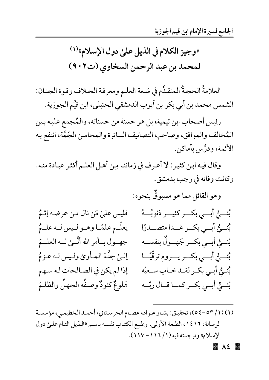 العلامةُ الحجةُ المتقدِّم في سَعة العلم ومعرفة الخلاف وقوة الجنان: الشمس محمد بن أبي بكر بن أيوب الدمشقي الحنبلي، ابن قيِّم الجوزية.