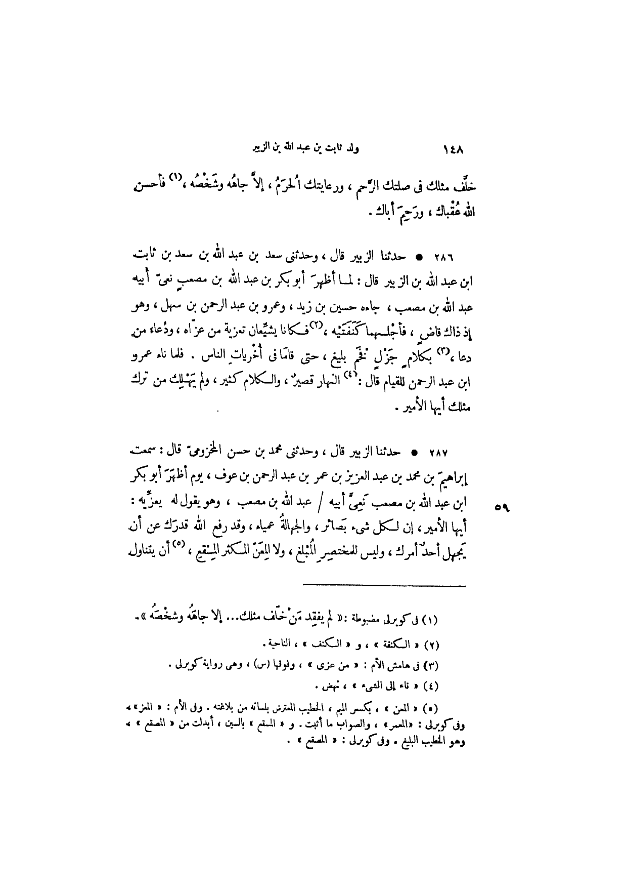 حدثنا الزبير قال، وحدثني محمد بن حسن المخزومي قال: سمعت إبراهيم بن محمد بن عبد العزيز بن عمر بن عبد الرحمن بن عوف، يوم أظهر أبو بكر ابن عبد الله بن مصعب نعى أبيه عبد الله بن مصعب، وهو يقول له يعزيه: أيها الأمير، إن لكل شيء بصائر، والجهالة عمياء، وقد رفع الله قدرك عن أن يجهل أحد أمرك، وليس للمختصر المبلغ، ولا المعن المكثر المسقع، أن يتناول