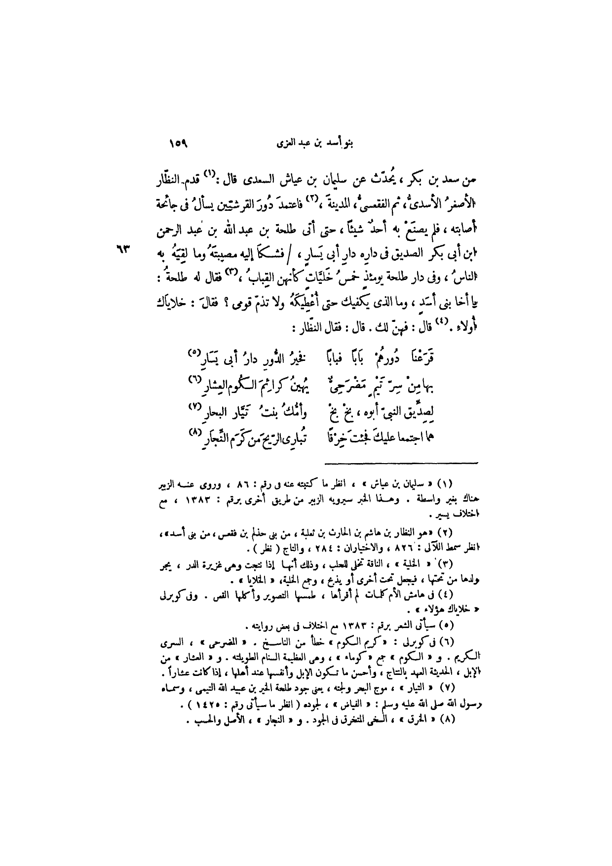 من سعد بن بكر، يحدث عن سليمان بن عياش السعدي قال: قدم النظار الأصغر الأسدي، ثم الفقعسي، المدينة، فأعتمد دور القرشيين يسأل في جائحة أصابته، فلم يصنع به أحد شيئاً، حتى أتى طلحة بن عبد الله بن عبد الرحمن ابن أبي بكر الصديق في داره دار أبي يسار، فشكا إليه مصيبته وما لقيه به الناس، وفي دار طلحة يومئذ خمس خليات كأنهن القباب، فقال له طلحة: يا أخا بني أسد، وما الذي يكفيك حتى أعطيكه ولا تذم قومي؟ فقال: خلاياك أولاء. قال: فهن لك. قال: فقال النظار: