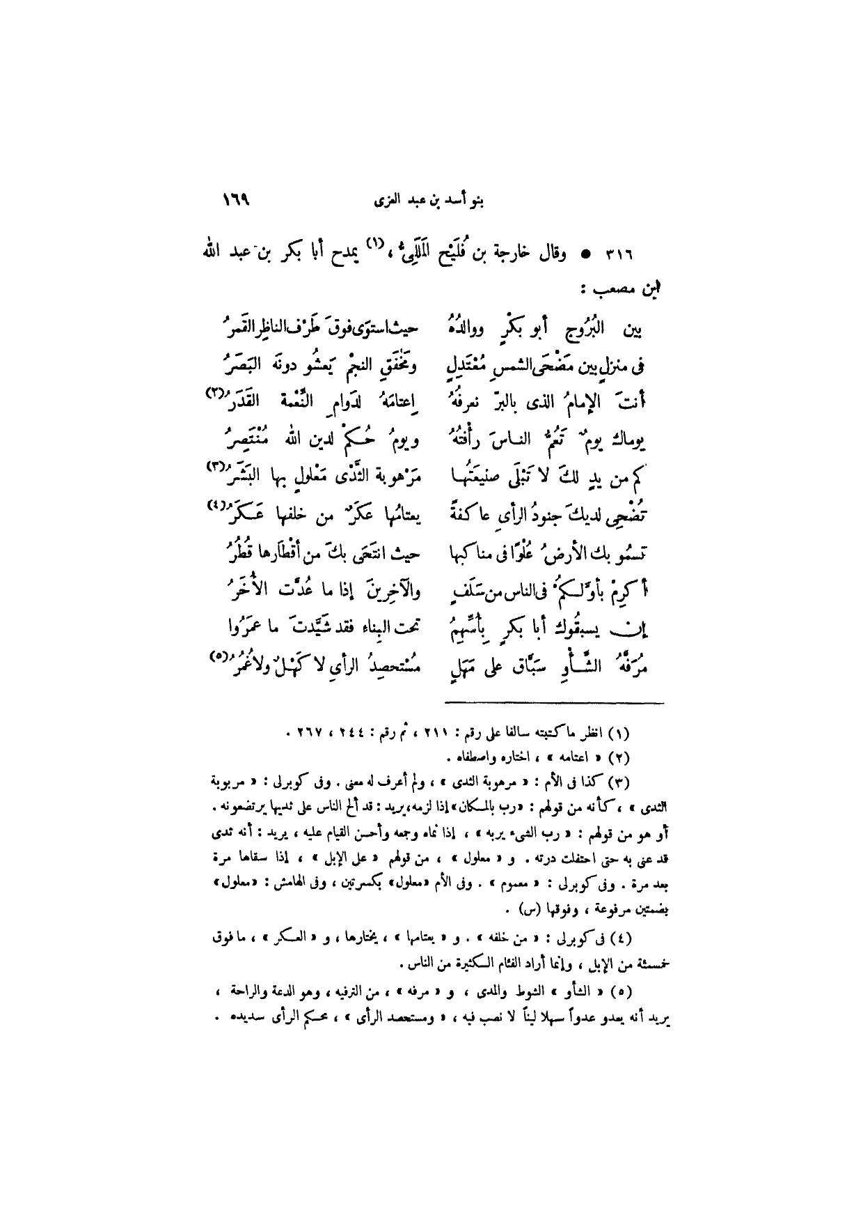 وقال خارجة بن فُلَيْح المللىُّ، يمدح أبا بكر بن عبد الله ابن مصعب: