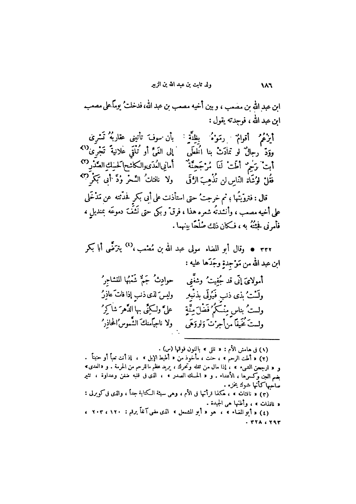 قال: فترويتها، ثم خرجت حتى استأذنت على أبي بكر فحدثته عن مدخلي على أخيه مصعب، وأنشدته شعره هذا، فرق وبكى حتى نشف دموعه بمنديلٍ، فأمرني فجئته به، فكان ذلك صلحاً بينهما.