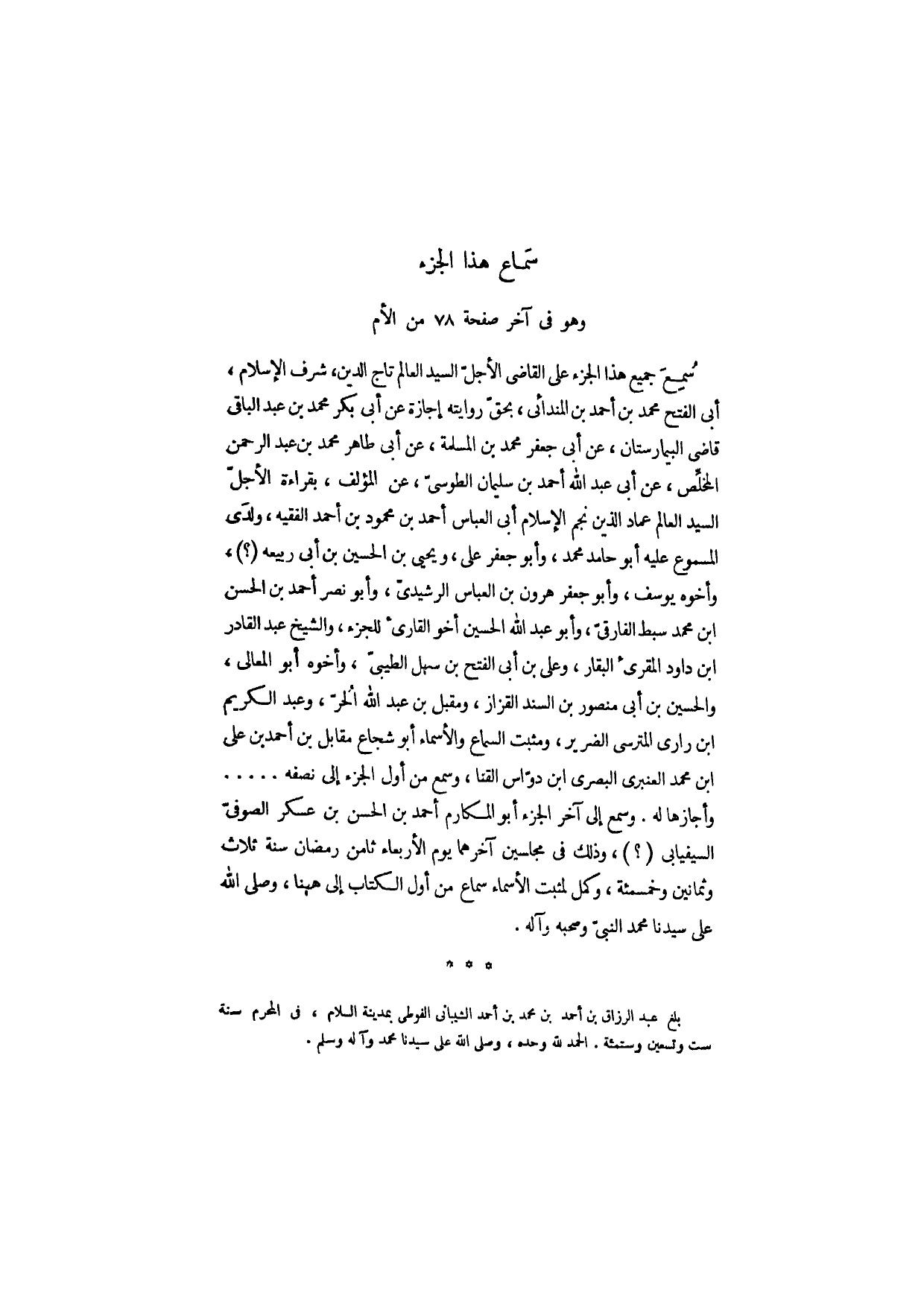 بلغ عبد الرزاق بن احمد بن محمد بن أحمد الشيباني الفوطي بمدينة السلام، في المحرم سنة ست وتسعين وستمئة. الحمد لله وحده، وصلى الله على سيدنا محمد وآله وسلم.