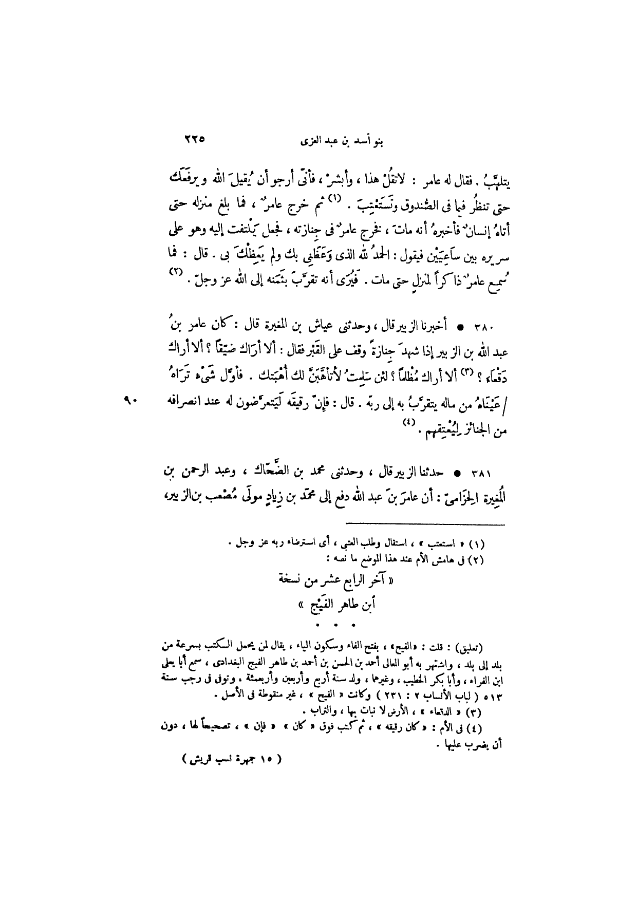 حدثنا الزبير قال، وحدثني محمد بن الضحاك، وعبد الرحمن بن المغيرة الحزامي: أن عامر بن عبد الله دفع إلى محمد بن زياد مولى مصعب بن الزبير،