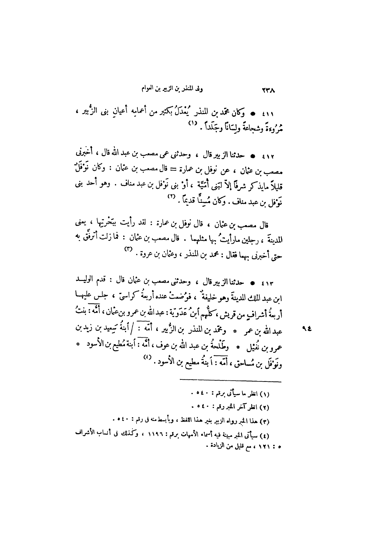حدثنا الزبير قال، وحدثني مصعب بن عثمان قال: قدم الوليد ابن عبد الملك المدينة وهو خليفة، فوضعت عنده أربعة كراسي، جلس عليها أربعة أشراف من قريش، كلهم ابن عدوية: عبد الله بن عمرو بن عثمان، أمه: بنت عبد الله بن عمر ومحمد بن المنذر بن الزبير، وأمه: ابنة سعيد بن زيد بن عمرو بن نفيل وطلحة بن عبد الله بن عوف، أمه: ابنة مطيع بن الأسود ونوفل بن مساحق، أمه: ابنة مطيع بن الأسود.