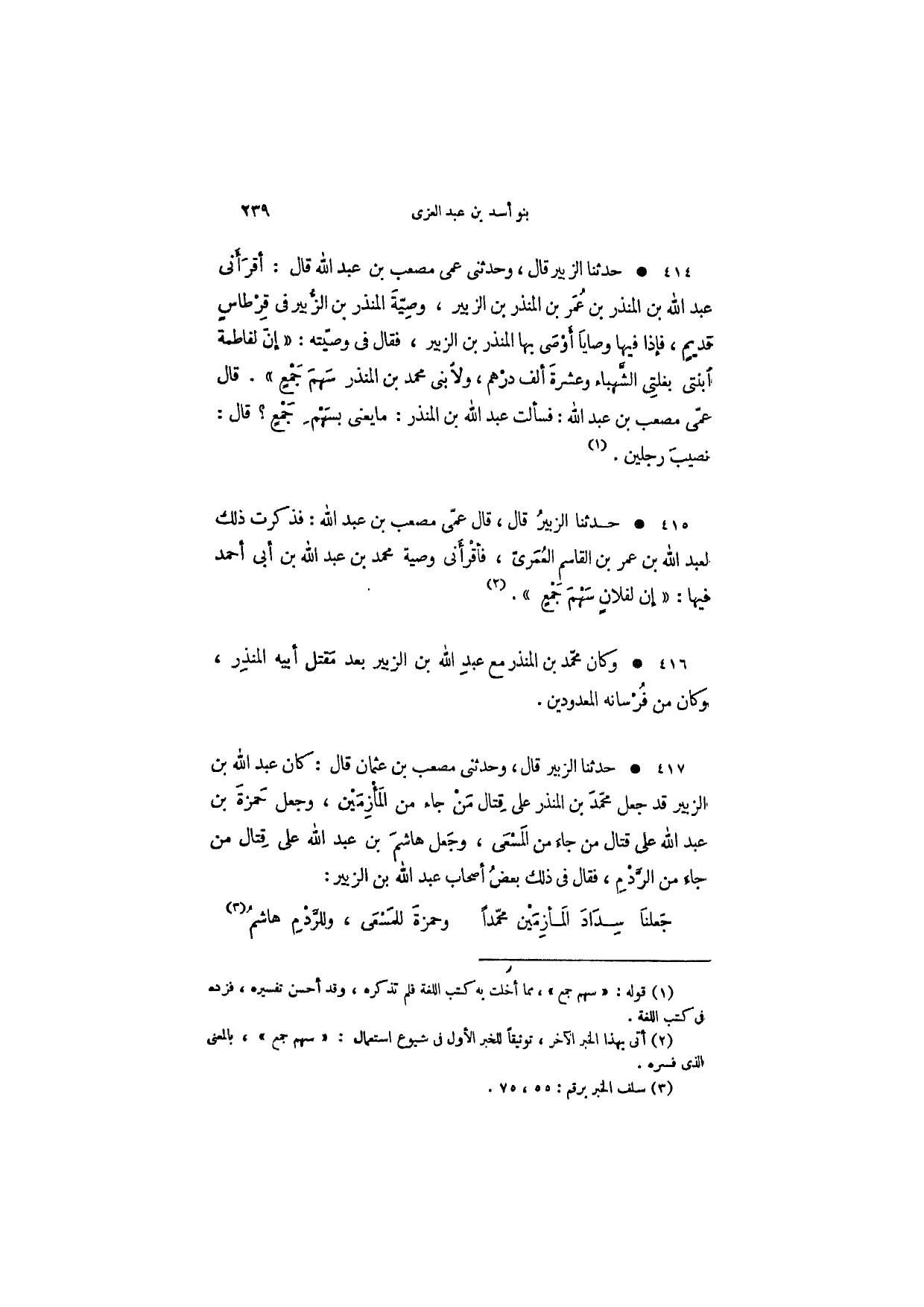 حدثنا الزبير قال، قال عمي مصعب بن عبد الله: فذكرت ذلك لعبد الله بن عمر بن القاسم العمري، فأقرأني وصية محمد بن عبد الله بن أبي لأحمد فيها: " إن لفلان سهم جمع ".