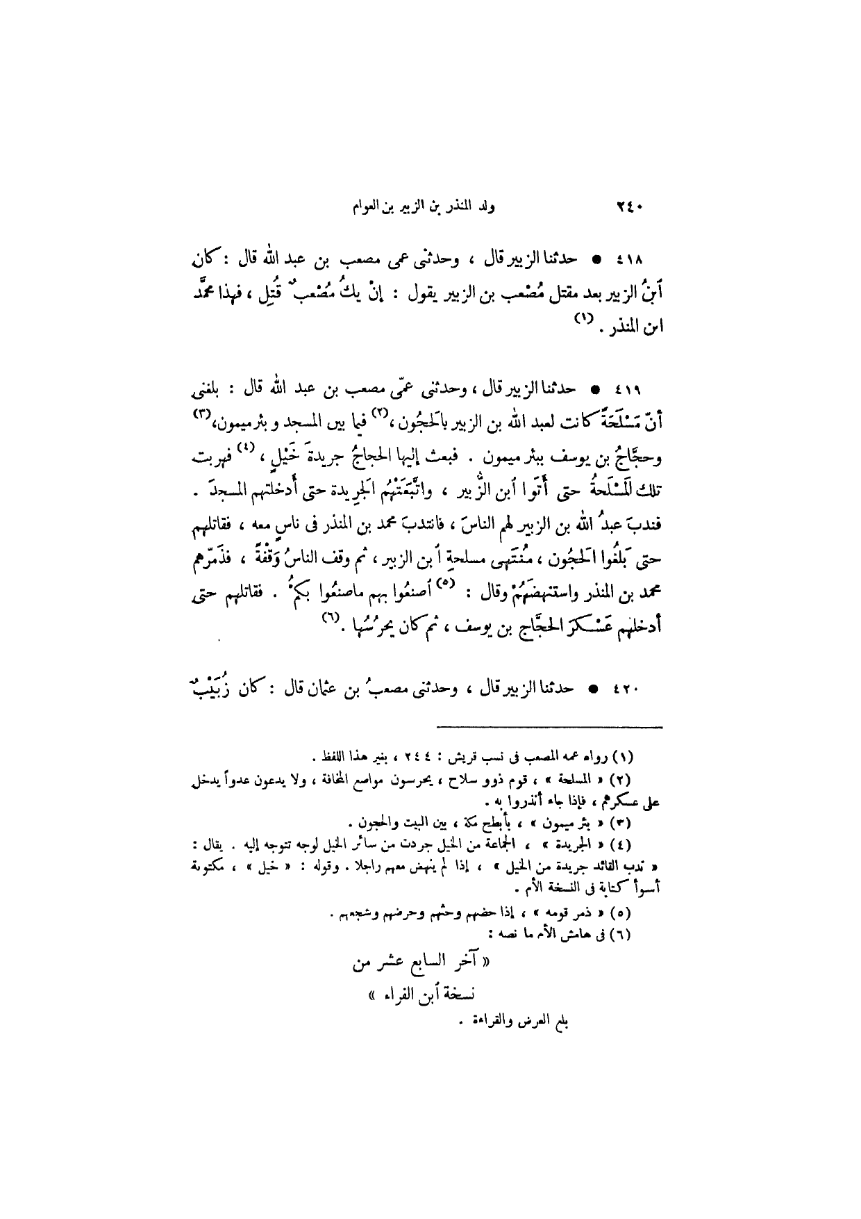 حدثنا الزبير قال، وحدثني عمي مصعب بن عبد الله قال: بلغني أن مسلحة كانت لعبد الله بن الزبير بالحجون، فيما بين المسجد وبئر ميمون، وحجاج بن يوسف ببئر ميمون. فبعث إليها الحجاج جريدة خيل، فهربت تلك المسلحة حتى أتوا ابن الزبير، واتبعتهم الجريدة حتى أدخلتهم المسجد. فندب عبد الله بن الزبير لهم الناس، فأنتدب محمد بن المنذر في ناس معه، فقاتلهم حتى بلغوا الحجون، منتهى مسلحة ابن الزبير، ثم وقف الناس وقفة، فذمرهم محمد بن المنذر واستنهضهم وقال: اصنعوا بهم ما صنعوا بكم. فقاتلهم حتى أدخلهم عسكر الحجاج بن يوسف، ثم كان يحرسها.