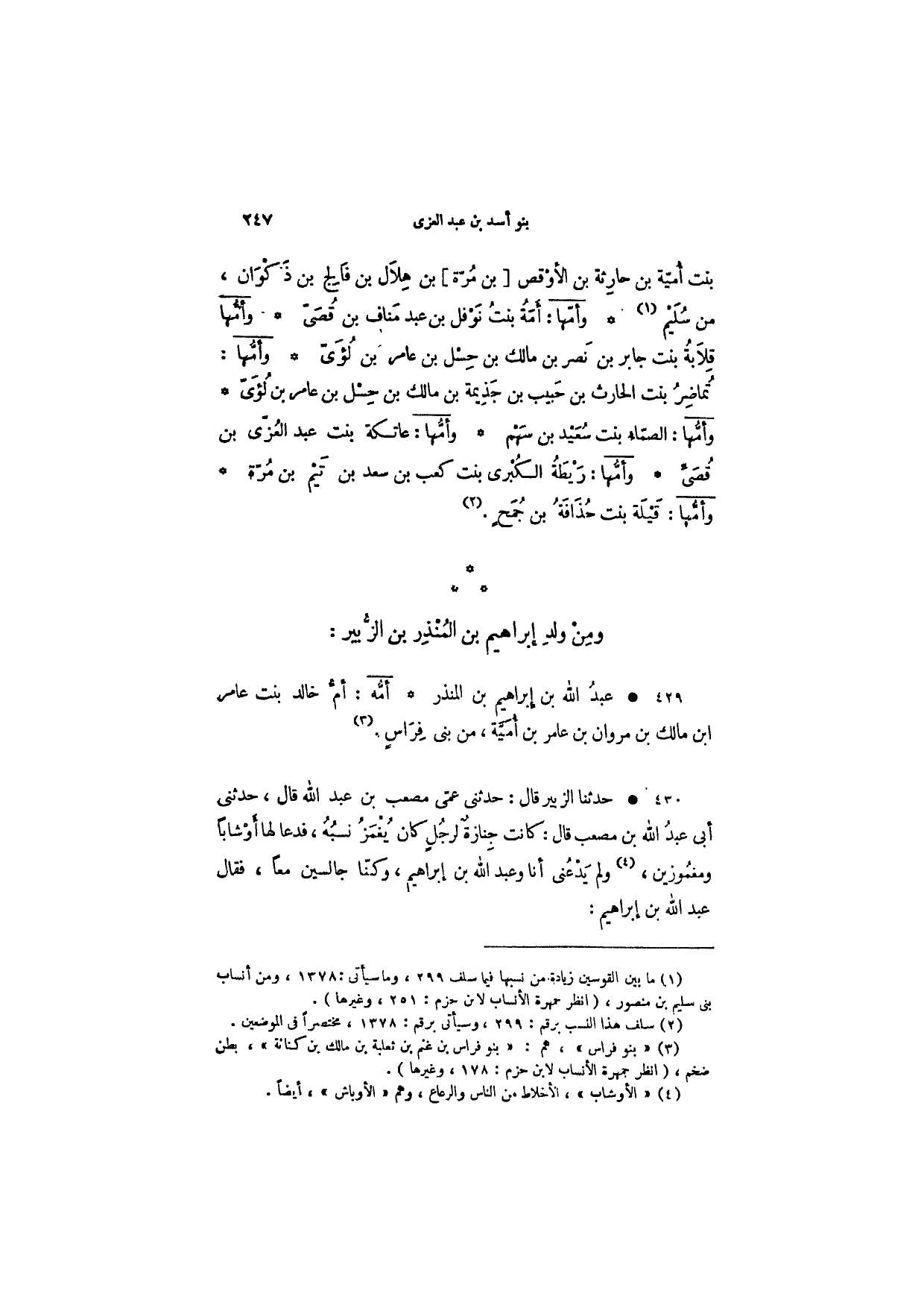 حدثنا الزبير قال: حدثني عمي مصعب بن عبد الله قال، حدثني أبي عبد الله بن مصعب قال: كانت جنازة لرجل كان يغمز نسبة، فدعا لها أو شاباً ومغموزين، ولم يدعني أنا وعبد الله بن إبراهيم، وكان جالسين معاً، فقال عبد الله بن إبراهيم: