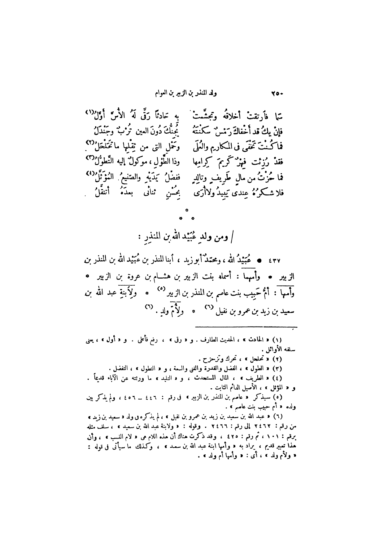 عبيد الله، ومحمد أبو زيد، ابنا المنذر بن عبيد الله بن المنذر بن الزبير وأمهما: أسماء بنت الزبير بن هاشم بن عروة بن الزبير وأمها: أم حبيب عاصم بن المنذر بن الزبير ولابنة عبد الله بن سعيد بن زيد بن عمرو بن نفيل ولأم ولد.
