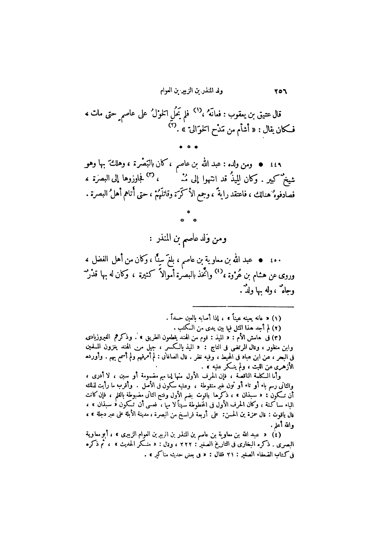 ومن ولده: عبد الله بن عاصم، كان بالبصرة، وهلك بها هو شيخ كبير. وكان المِيذُ قد انتهوا إلى، فجاوزوها إلى البصرة، فصادفوه هنالك، فأعتقد راية، وجمع الأكرة وقاتلهم، حتى أتاهم أهل البصرة.