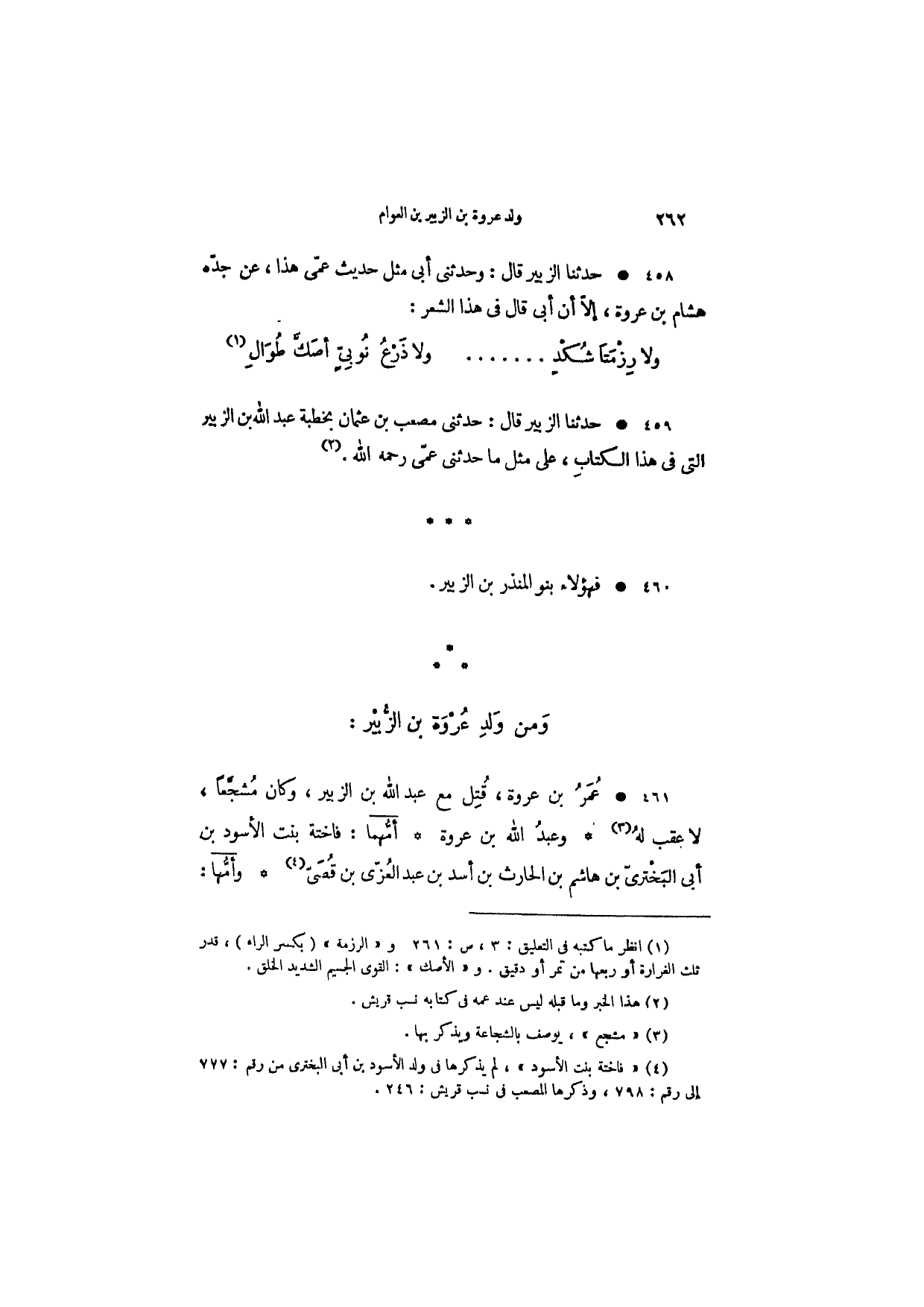حدثنا الزبير قال: وحدثني أبي مثل حديث عمي هذا، عن جده هشام بن عروة، إلا أن أبي قال في هذا الشعر:
