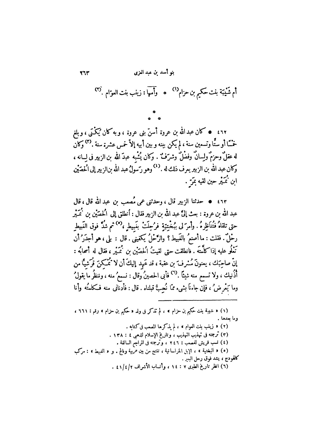 حدثنا الزبير قال، وحدثني عمي مصعب بن عبد الله قال، قال عبد الله بن عروة: بعث إلى عبد الله بن الزبير فقال: أنطلق إلى الحصين بن نمير حتى تلقاه فتناظره. وأمر لي ببختية فرحلت بغبيط، ثم شد فوق الغبيط رحل. فقلت: ما أصنع بالغبيط؟ والرحل يكفيني. قال: بلى، هو أجدر أن تعلو عليه إذا كلمته. فانطلقت حتى لقيت الحصين بن نمير، فقال له أصحابه: إن صاحبك، يعنون مسرف بن عقبة، قد عهد إليك أن لا تمكن قرشياً من أذنيك، ولا تسمع منه شيئاً. فأبى الحصين وقال: نسمع منه، وننظر ما يقول وما يعرض، فإن جاءنا بشيء مما نحب قبلناه. قال: فأدناني منه فكلمته وأنا