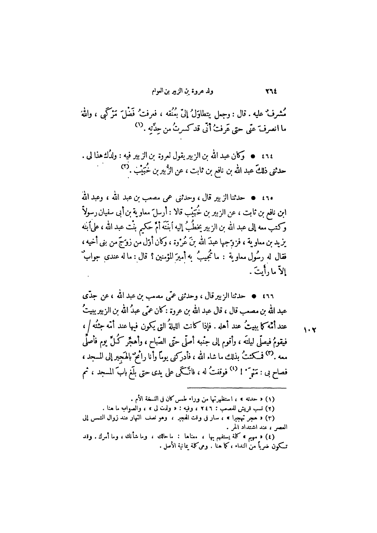 حدثنا الزبير قال، وحدثني عمي مصعب بن عبد الله، عن جدي عبد الله بن مصعب قال، قال عبد الله بن عروة: كان عمي عبد الله بن الزبير يبيت عند أمه كما يبيت عند أهله. فإذا كانت الليلة التي يكون فيها عند أمه جئته، فيقوم فيصلى ليلته، وأقوم إلى جنبه أصلي حتى الصباح، وأهجر كل يوم فأصلى معه. فمكث بذلك ما شاء الله، فأدركني يوماً وأنا رائح بالهجير إلى المسجد، فصاح بي: مهيم! فوقفت له، فاتكى على يدي حتى بلغ باب المسجد، ثم