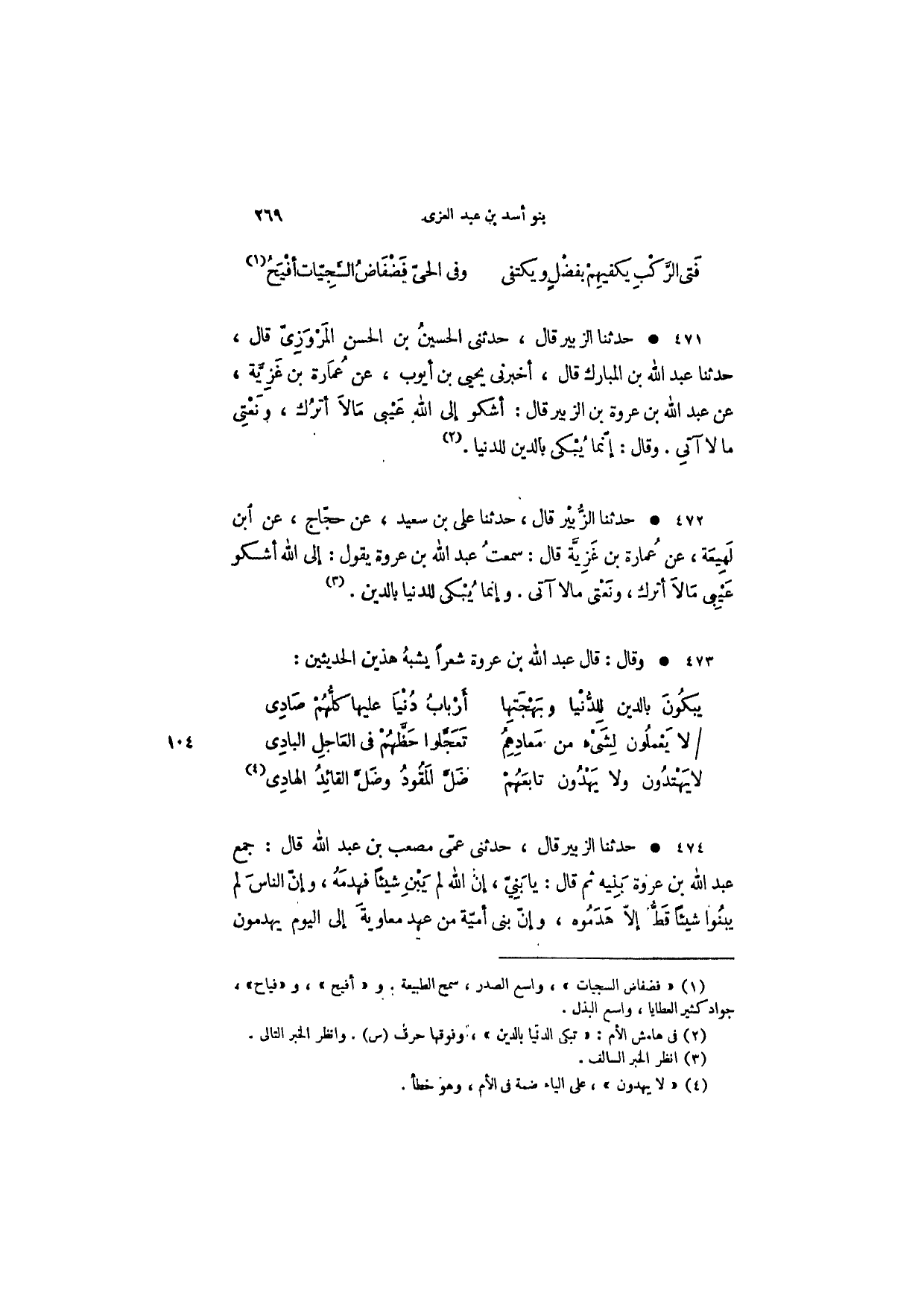 حدثنا الزبير قال، حدثني الحسين بن الحسن المروزي قال، حدثنا عبد الله بن المبارك قال، أخبرني يحيى بن أيوب، عن عمارة بن غزية، عن عبد الله بن عروة بن الزبير قال: أشكو إلى الله عيبي مالا أترك، ونعتي ما لا آتي. وقال: إنما يبكي بالدين للدنيا.