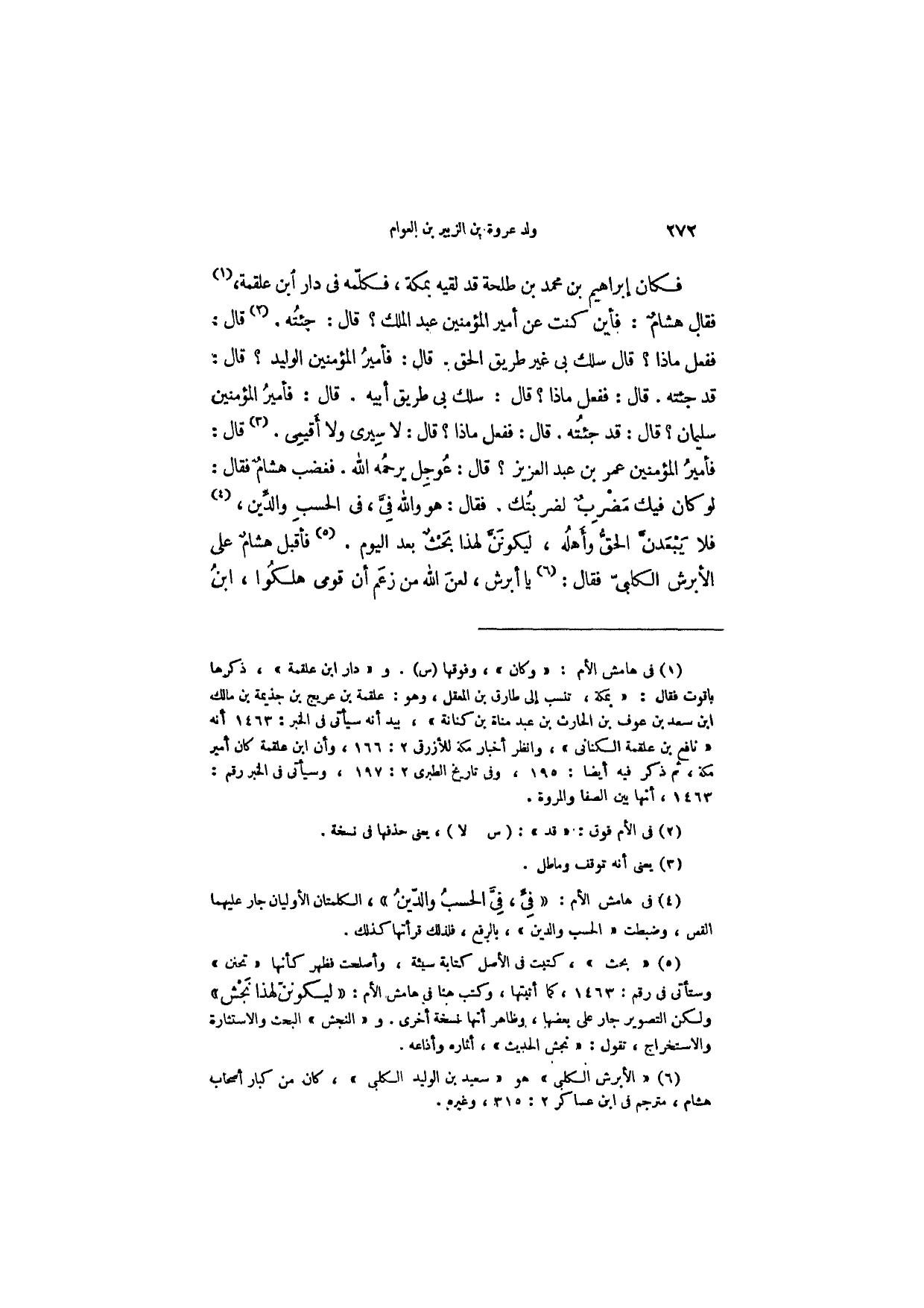 فكا إبراهيم بن محمد بن طلحة قد لقيه بمكة، فكلمه في دار ابن علقمة، فقال هشام: فأين طنت عن أمير المؤمنين عبد الملك؟ قال: جئته. قال: ففعل ماذا؟ قال سلك بي غير طريق الحق. قال: فأمير المؤمنين الوليد؟ قال: قد جئته. قال: ففعل ماذا؟ قال: سلك بي طريق أبيه. قال: فأمير المؤمنين سليمان؟ قال: قد جئته. قال: ففعل ماذا؟ قال: لا سيري ولا أقيمي. قال: فأمير المؤمنين عمر بن عبد العزيز؟ قال: عوجل يرحمه الله. فغضب هشام فقال: لو كان فيك مضرب لضربتك. فقال: هو الله في، في الحسب والدين، فلا يبعدن الحق وأهله، ليكونن لهذا بحث بعد اليوم. فأقبل هشام على الأبرش الكلبي فقال: يا أبرش، لعن الله من زعم أن قومي هلكوا، ابن