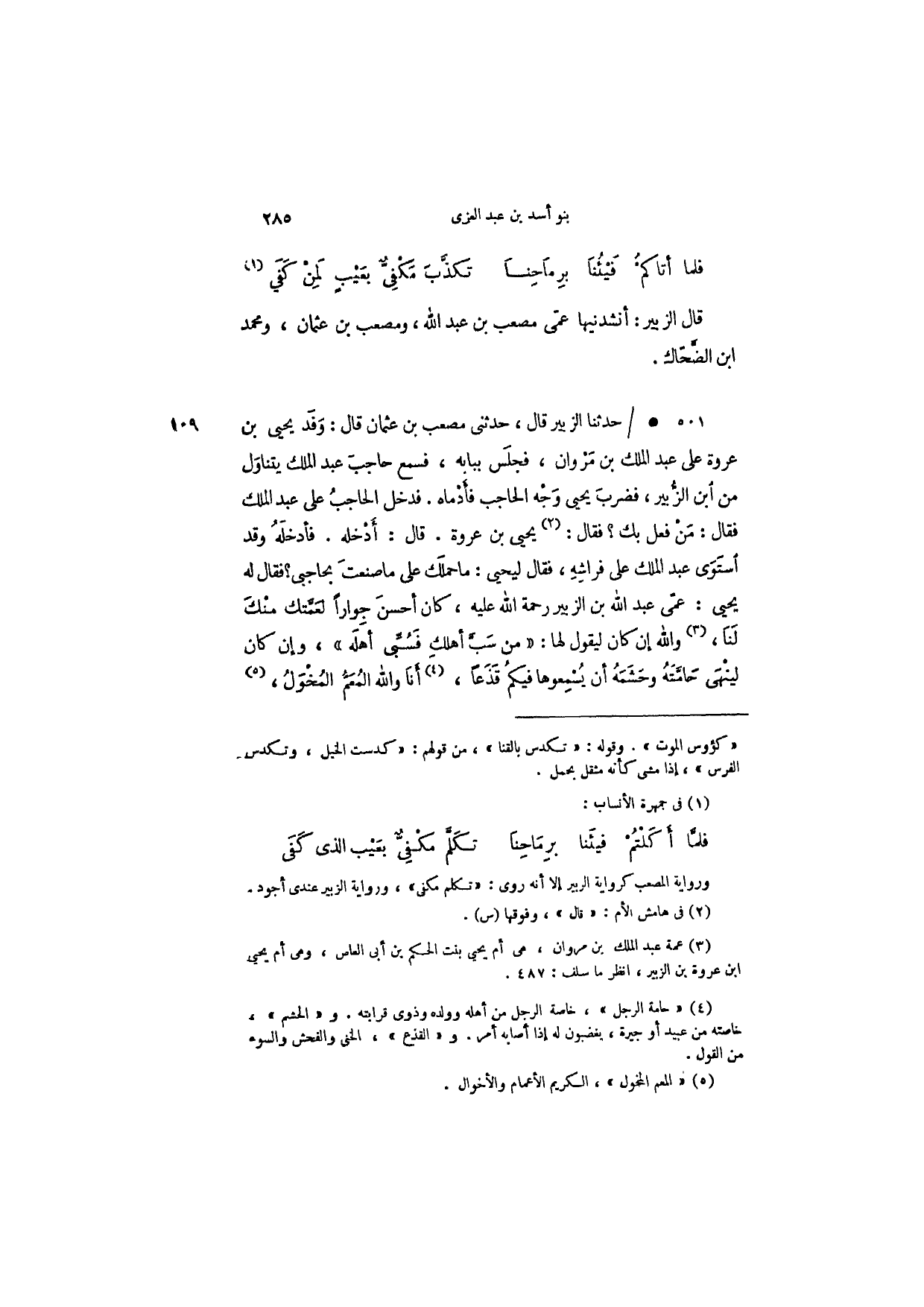 حدثنا الزبير قال، حدثني مصعب بن عثمان قال: وفد يحيى بن عروة على عبد الملك بن مروان، فجلس ببابه، فسمع حاجب عبد الملك يتناول من ابن الزبير، فضرب يحيى وجه الحاجب فأدماه. فدخل الحاجب على عبد الملك فقال: من فعل بك؟ فقال: يحيى بنعروة. قال: أدخله. فأدخله وقد استوى عبد الملك على فراشه، فقال ليحيى: ما حملك على ما صنعت بحاجبي؟ فقال له يحيى: عمي عبد الله بن الزبير رحمة الله عليه، كان أحسن جواراً لعمتك منك لنا، والله إن كان ليقول لها: " من سب أهلك فسبي أهله "، وإن كان لينهي حامته وحشمته أن يسمعوها فيكم قذعاً، أنا والله المعم المخول،